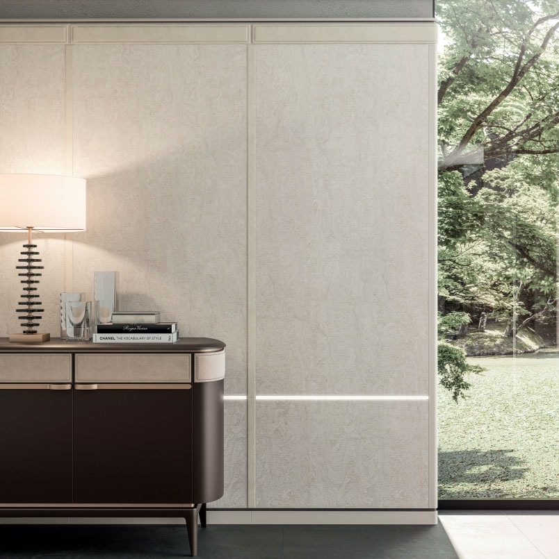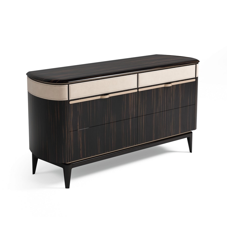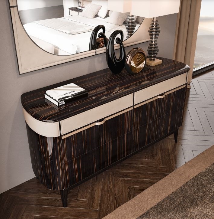 Schubladen: Holz mit Leder oder Stoff. Innenlackiertes Holz und in Mikrofaser überzogen, mit einem Push-Pull-System geöffnet.