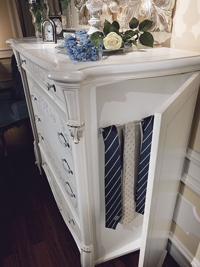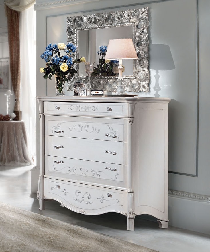 Kommode aus lackiertem Holz mit silbernen Verzierungen.