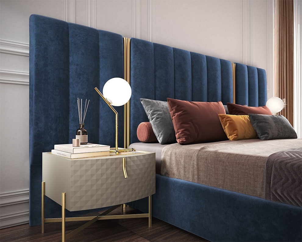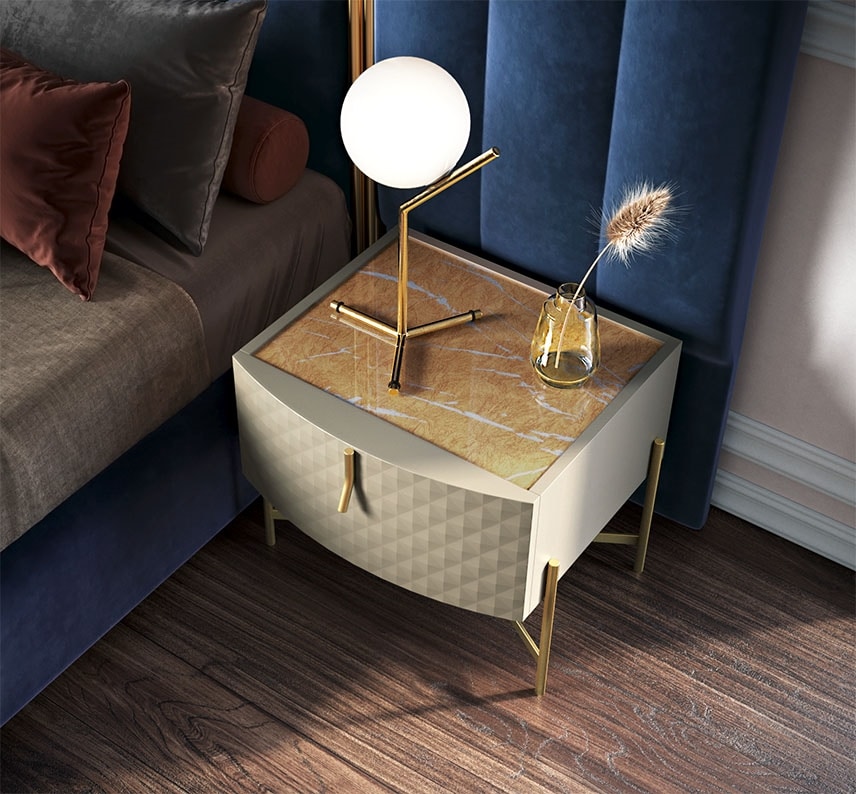 Kommode und Nachttische aus seilfarbenem Holz und Craquelé-Marmorplatte. Füße aus goldenem Metall.