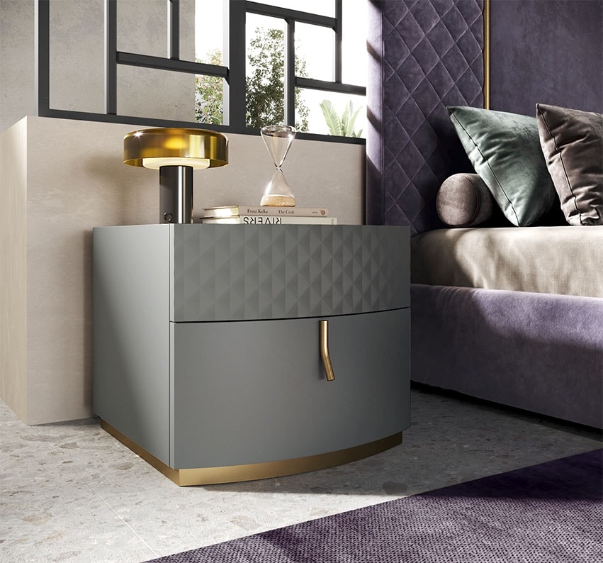 Kommode und zwei moderne Nachttische aus titanfarbenem Holz mit Craquelé-Marmorplatte.