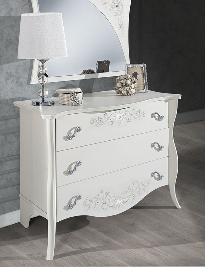 Komplette Triptychon-Kommode und nr. zwei Tiffany-Modell-Nachttische, weiße Esche, mit handgefertigter Dekoration und Swarovski-Lichtpunkt. Schubladen mit Blumotion-Führungen, sanftes Öffnen.