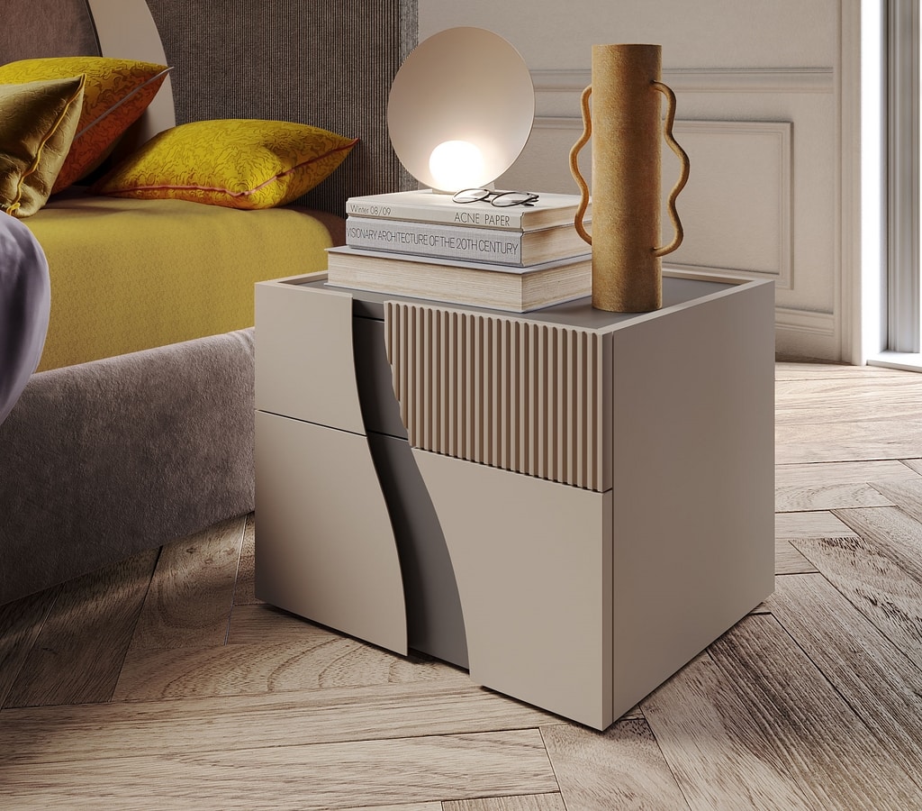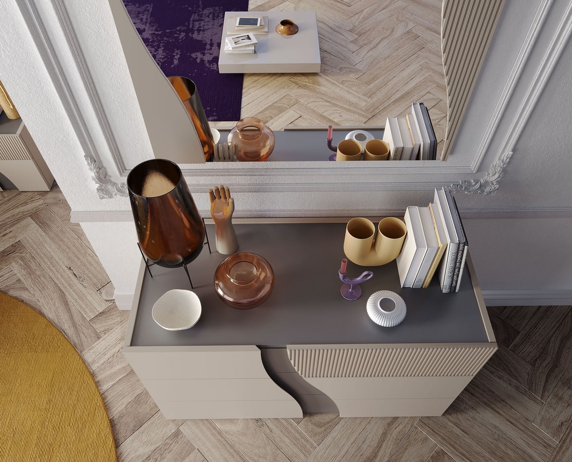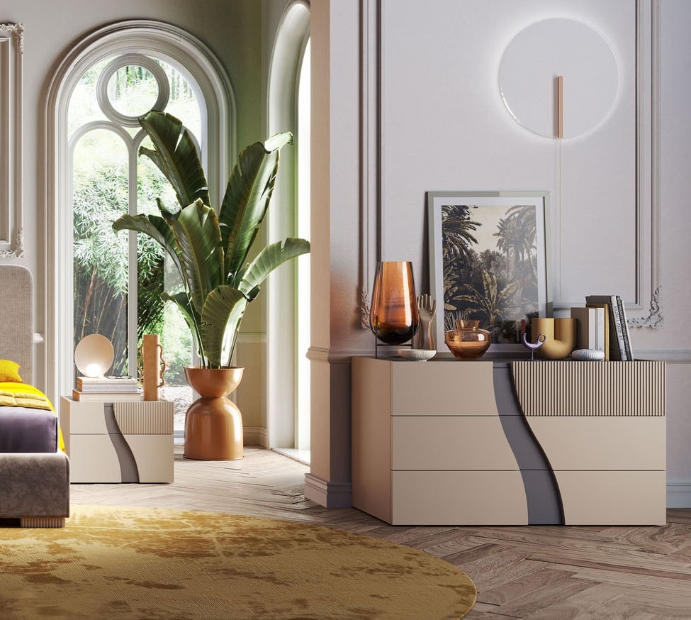 Die Triptychon-Kommode und die Nachttische werden durch die zentrale Trennung in Titan und die Rippen umrissen, die sie als Ganzes verbessern.