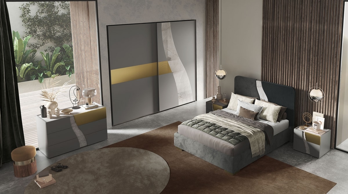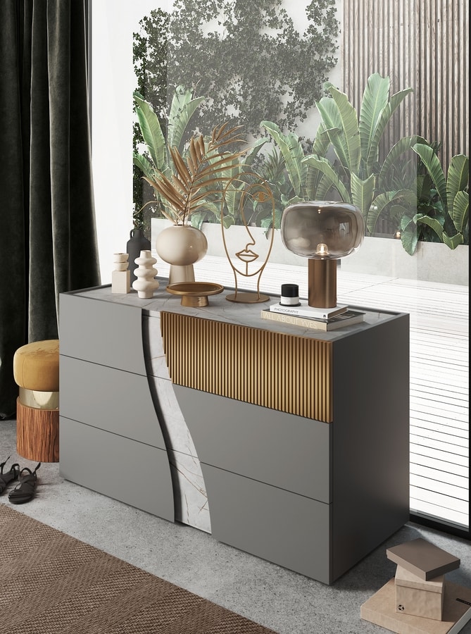 Das Wave-Zimmer ist Teil unserer neuen modernen Kollektion. Erhältlich in den Varianten Titan und Dolomitmarmor. Angereichert mit Goldrippen.