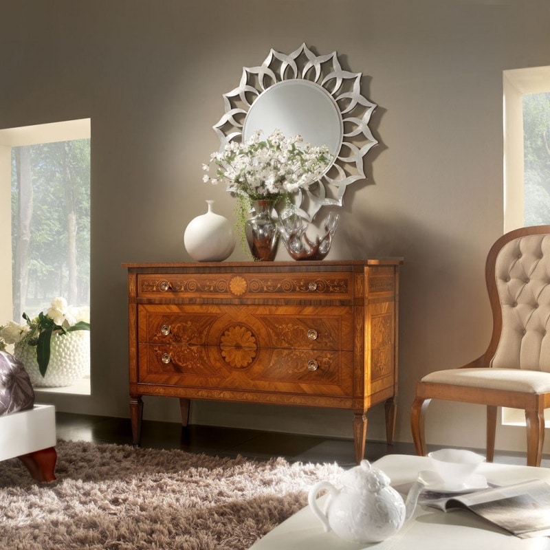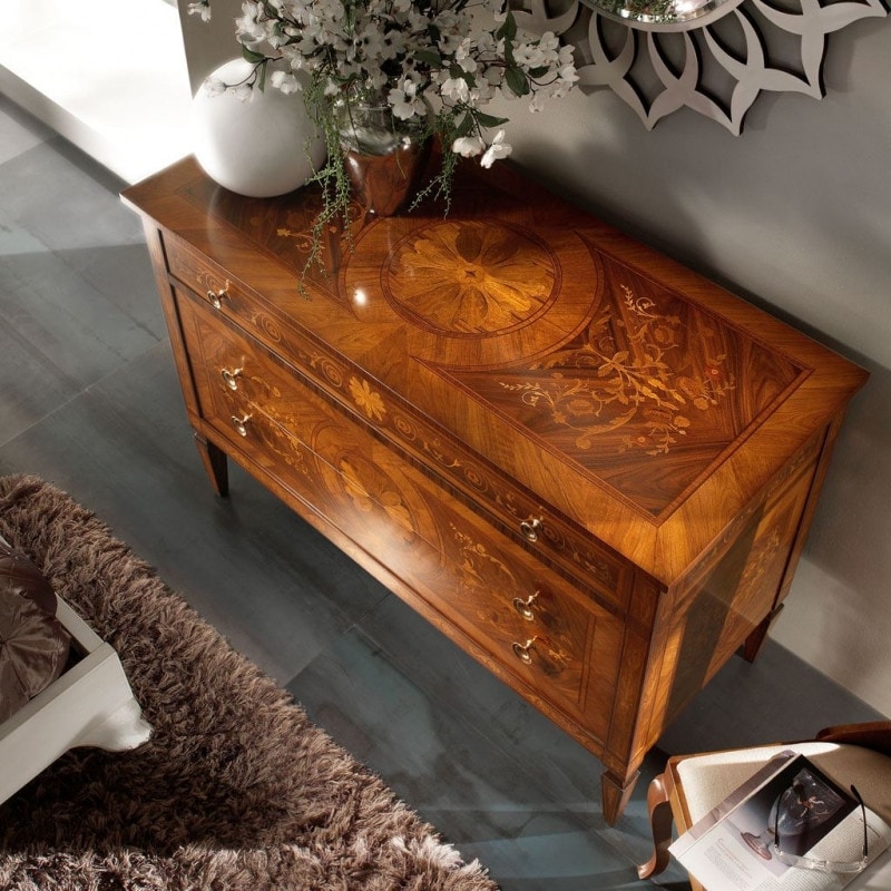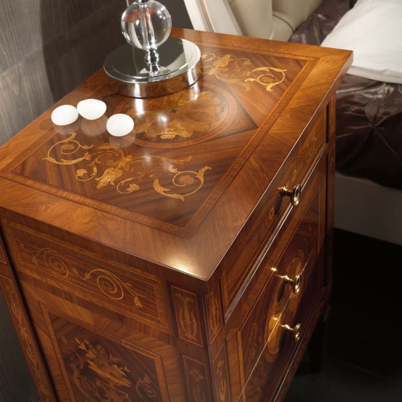 Preise anfordern Ähnliche ProdukteNachtgruppe bestehend aus einer Kommode und zwei Nachttischen. Kommode mit zwei großen Schubladen und einer kleineren, mit floralen Motiven eingelegt. Möbel, inspiriert vom großen Tischler Maggiolini. Einzigartige Werke, die mit alten Techniken hergestellt wurden, die die Meisterschaft der Vergangenheit in unsere Tage übertragen.