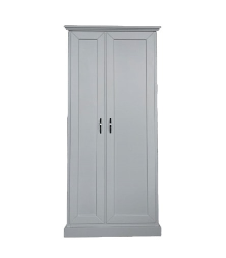 Besenhalter und Schuhregal aus Massivholz. 2 Fächer, von denen das linke Fach frei ist und das rechte Fach komplett mit 6 voll beweglichen, neigbaren und herausnehmbaren Innenböden. Ausgestattet mit 2 Türen unterschiedlicher Größe und Softclosing. Vom Kunden gewählte Griffe.