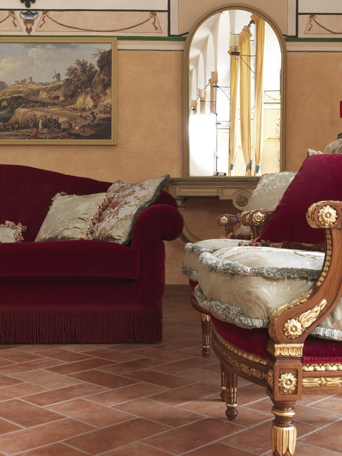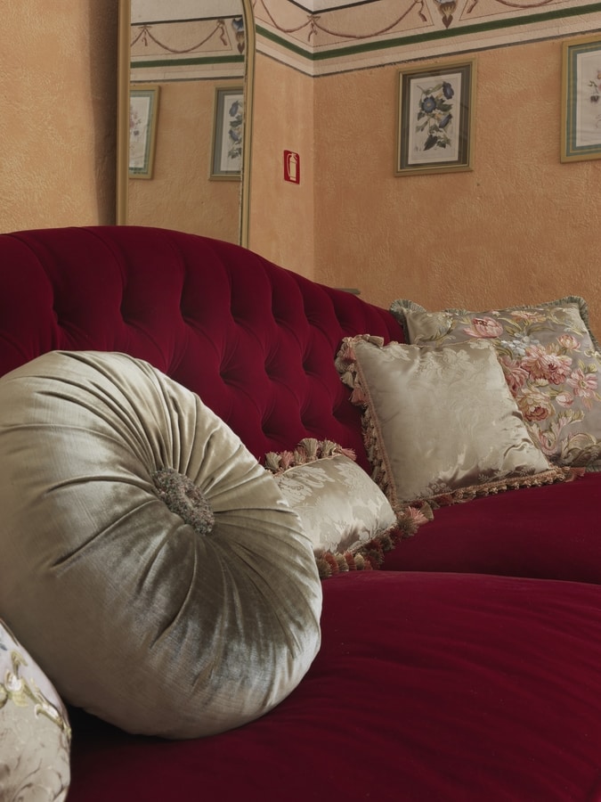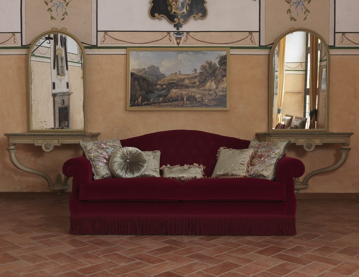 Gepolstertes Sofa, hergestellt in Übereinstimmung mit den Regeln der Polsterungstradition. Erhältlich mit einer großen Auswahl an Stofffarben.