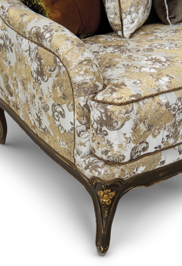 Das Sofa mit einem fein geschnitzten, festen Holzrahmen, das durch ein französisches Temperatur -Finish in Braun mit antiquierten und verzweifelten Blattgolddetails verbessert wird. Die Rückenlehne und die Armlehnen sind gepolstert und mit Damask -Stoff bedeckt. Ein Stück großer Eleganz, ideal für klassische und raffinierte Innenräume.