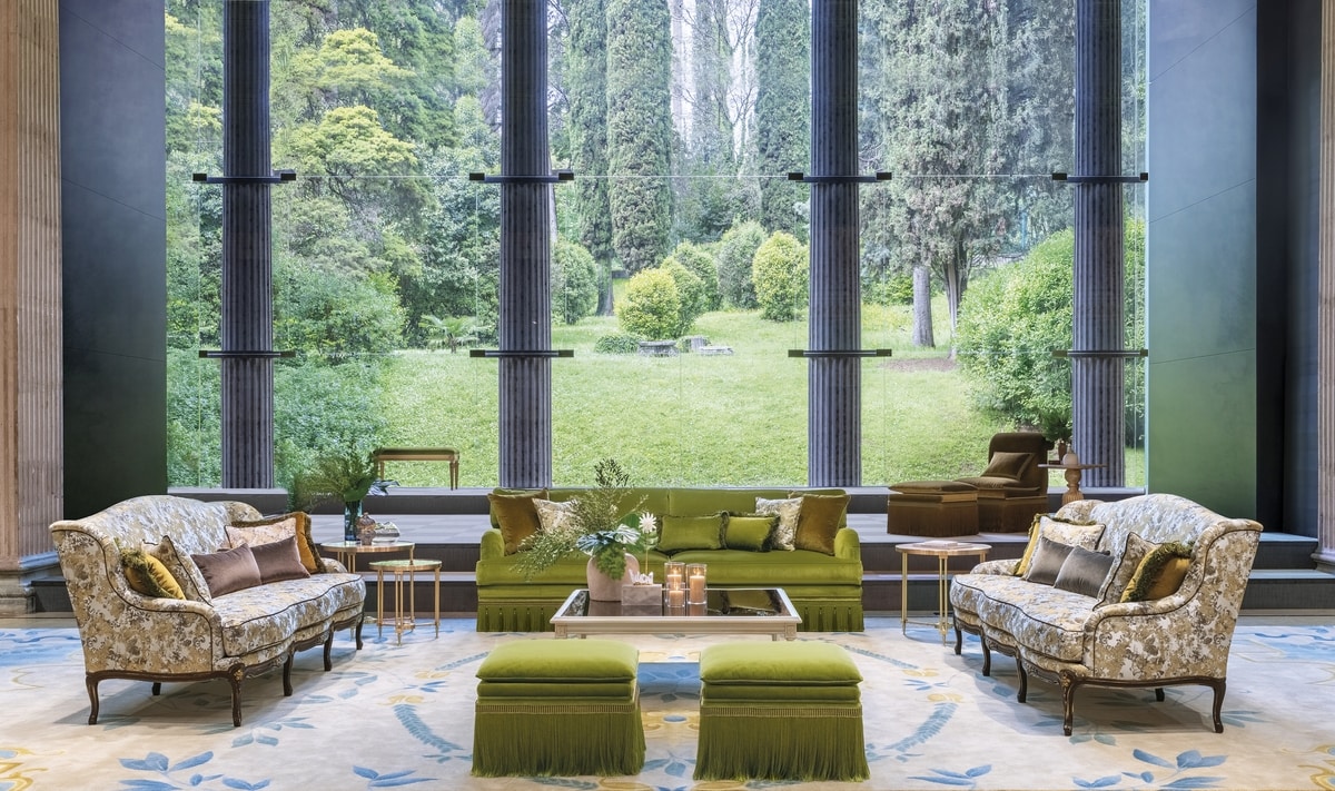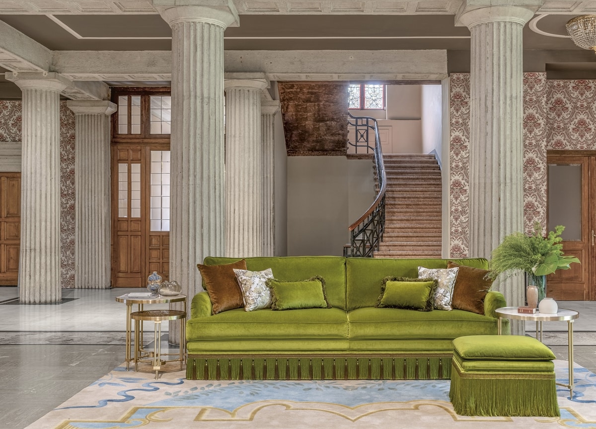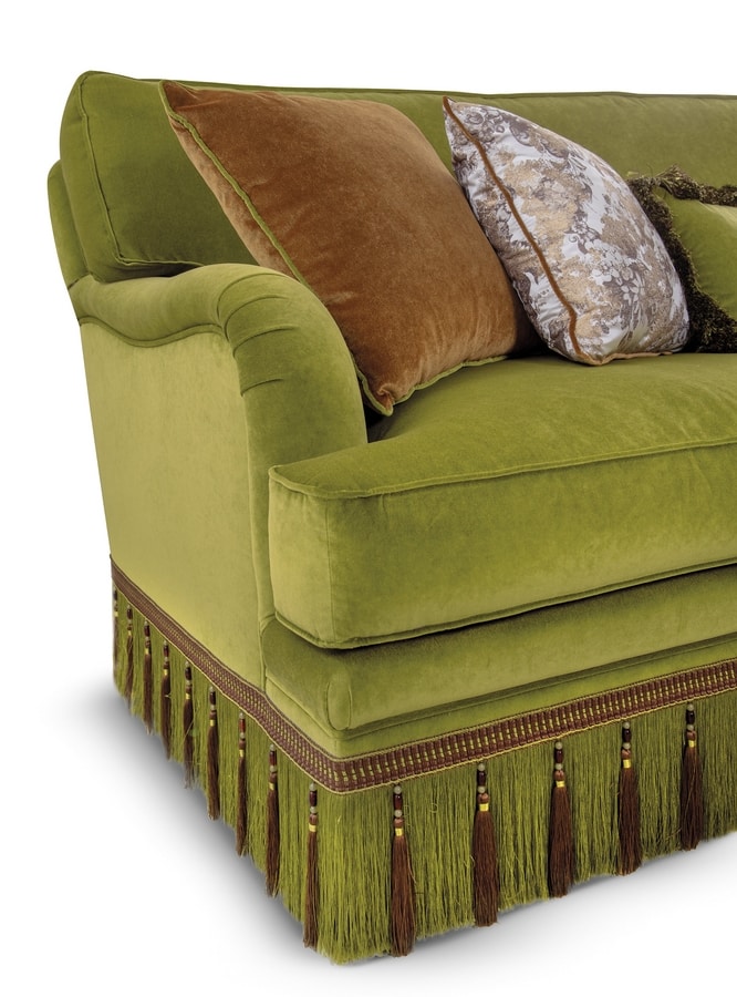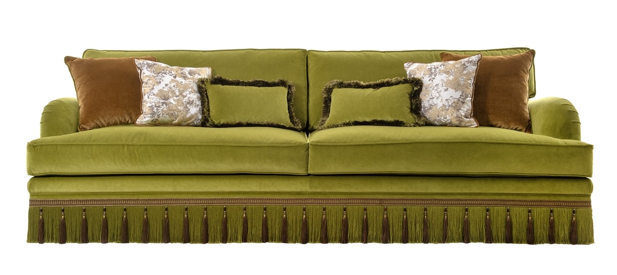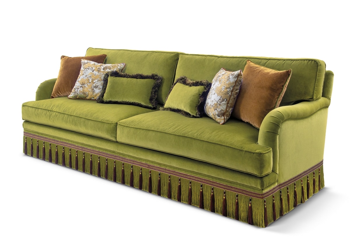 Dreisitzer-Sofa, die in feinem grünen Samt vollständig gepolstert wurden und mit einem eleganten dekorativen Rand an der Basis verziert sind. Weiche, großzügige Linien bieten umhüllenden Komfort, ergänzt durch koordinierte Samt- und gemusterte Kissen.