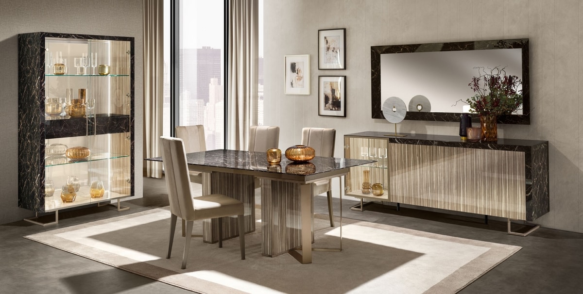 Made in Italy-Design und zeitgenössische Stimmung für die Luce Dark-Kollektion von Adora, entworfen, um Wohnzimmer, Esszimmer und Schlafbereich mit Stil und Eleganz einzurichten. Eine nüchterne und minimalistische Kollektion, die Asymmetrien durch kontrastierende Materialien und Formen betont. Das Leitmotiv der Kollektion ist neben dem namensgebenden Lichtelement die Suche nach einem Gleichgewicht zwischen Dichte und Transparenz, Referenzen und Variationen. Die Asymmetrie wird durch den Wechsel von offenen Fächern und geschlossenen Volumen sowie durch die Koexistenz des Portoro-Gold-Marmoreffekts (kalt und dunkel) auf den Oberseiten und Seiten und der Zebrano-Holzoptik (warm und klar) der Türen verstärkt. Die Füße und Griffe aus satiniertem Metall in der Farbe Champagner sind bewusst minimalistisch gehalten, um dem Design von Möbeln und Vitrinen die Hauptrolle zu überlassen. Sowohl die Spiegel als auch die Lichter in den Möbelelementen verleihen der Kollektion eine Fülle von Helligkeit, Perspektive und zeitgemäßem Reiz. Das Einrichtungskonzept würdigt die für den zeitgenössischen Stil typische Dynamik und das modische Design, ohne dabei edle Materialien, anspruchsvolles Design und luxuriöse Details aus den Augen zu verlieren.