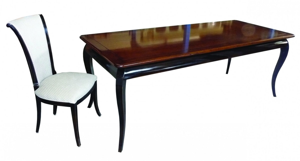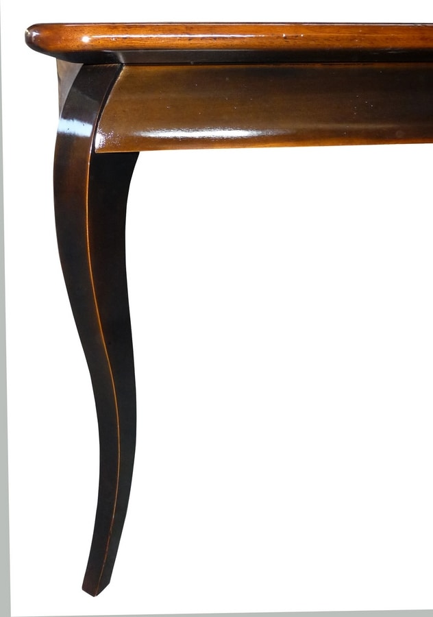 Cremlino ist ein Nussbaumtisch mit rechteckiger Platte und abgestumpften Ecken. Ein geformter Rahmen folgt dem unteren oberen Umfang bis zu den Säbelbeinen. Auf dem Foto, fleckiges Oberteil (Code: MI10) mit ebonisierten Beinen (Code: MI01 sfumato nero) und normalem Distressing.