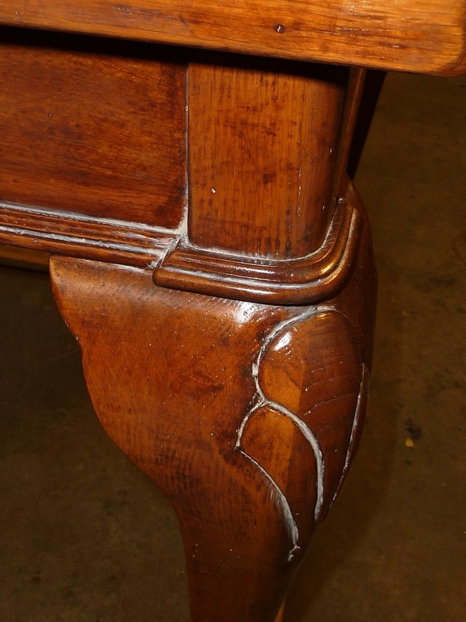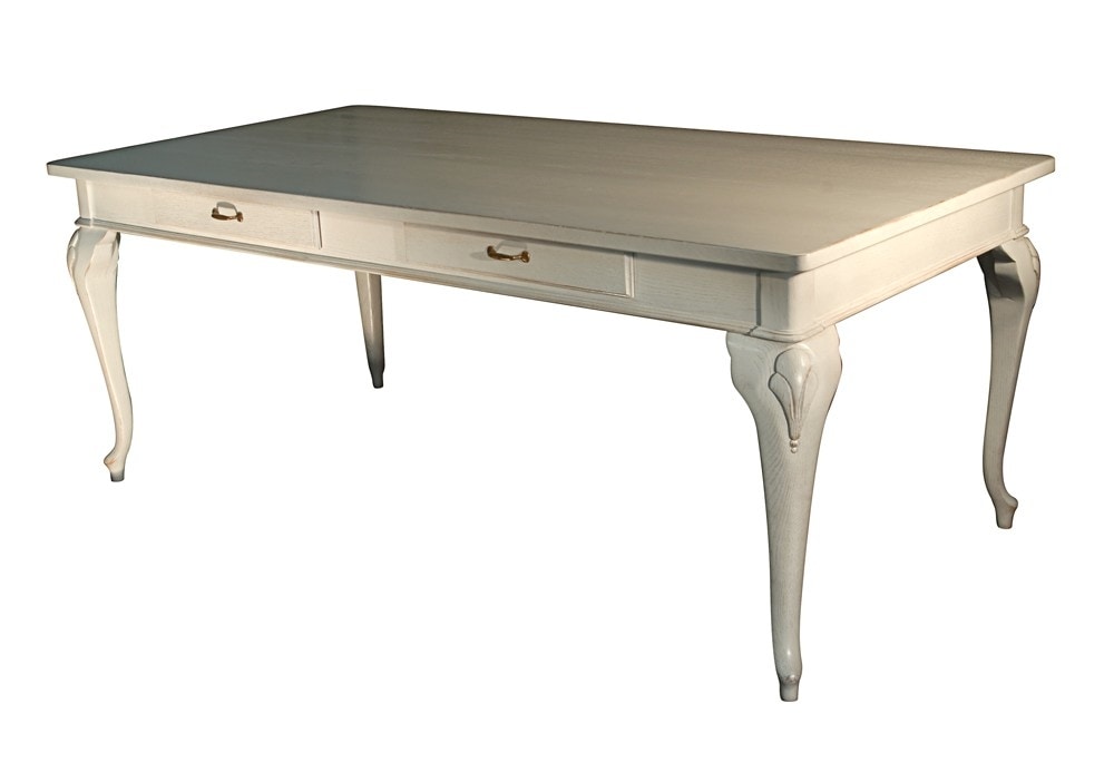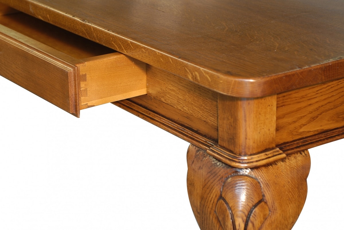Veneto-inspirierter rechteckiger fester Tisch mit zwei Schubladen, geformten und handgeschnitzten Beinen. Auf dem Foto gebeizte Eiche (Code: Rovere Antik) mit normaler Abnutzung.