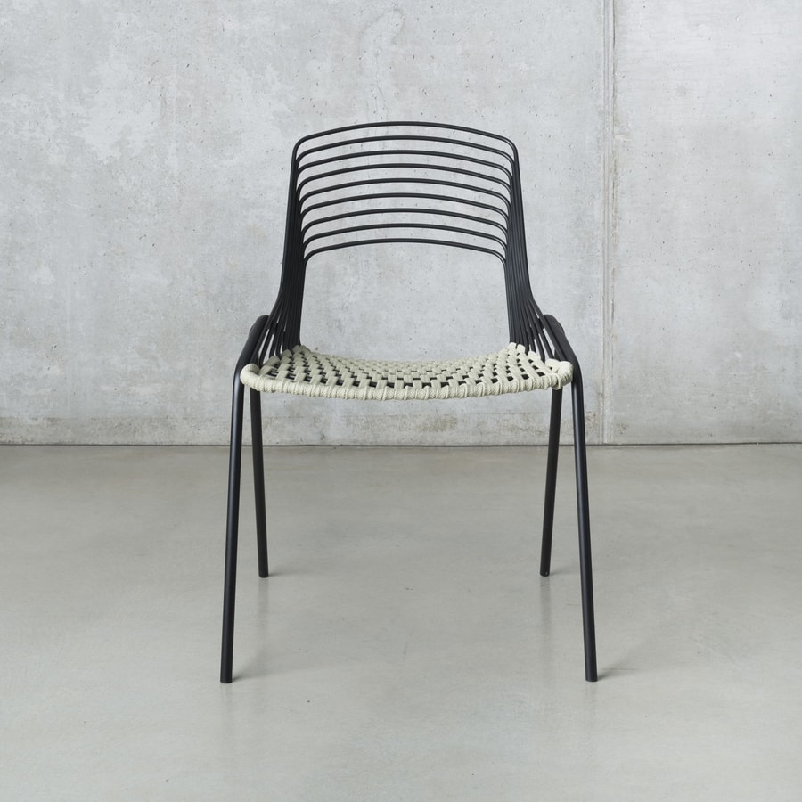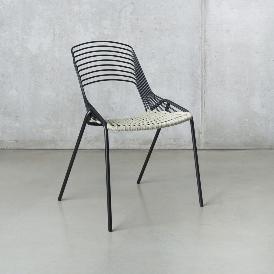 Stapelbarer Stuhl mit Struktur, Sitz und Rückenlehne aus gebeiztem Stahl. Erhältlich in 10 Standardfarben oder auf Anfrage in Kundenfarbe. Sitz mit Außenseilen.