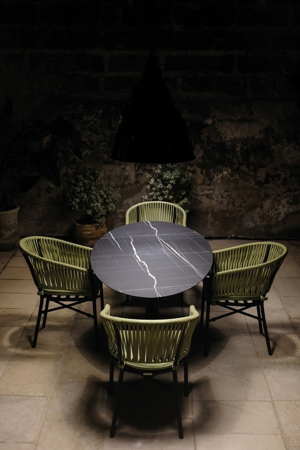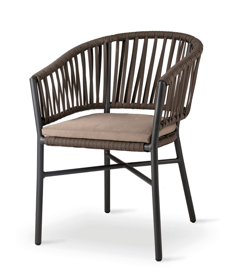 Stuhl aus anthrazit lackiertem Aluminium. Textilene Seil in brauner Farbe. Kissen aus taubengrauem Stoff.