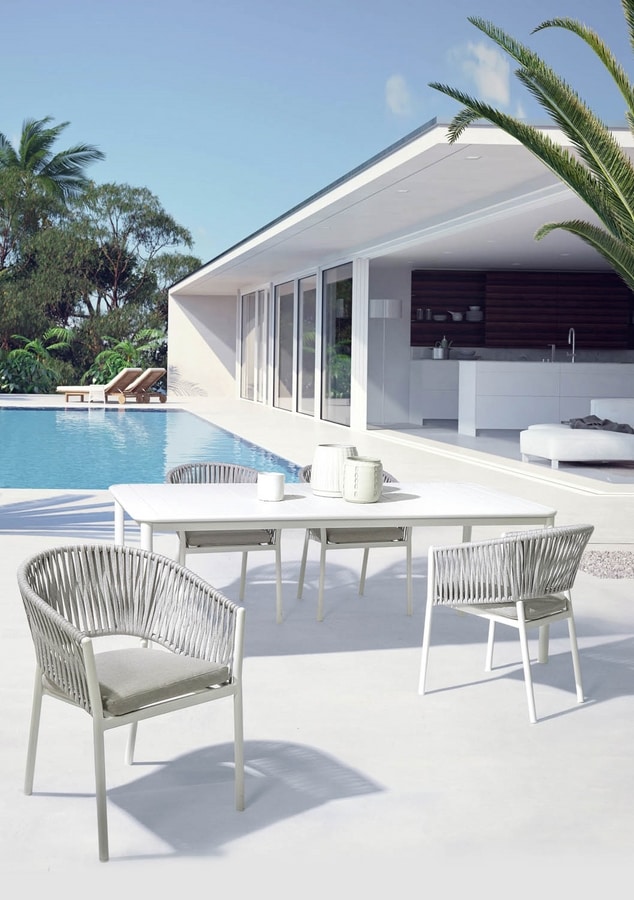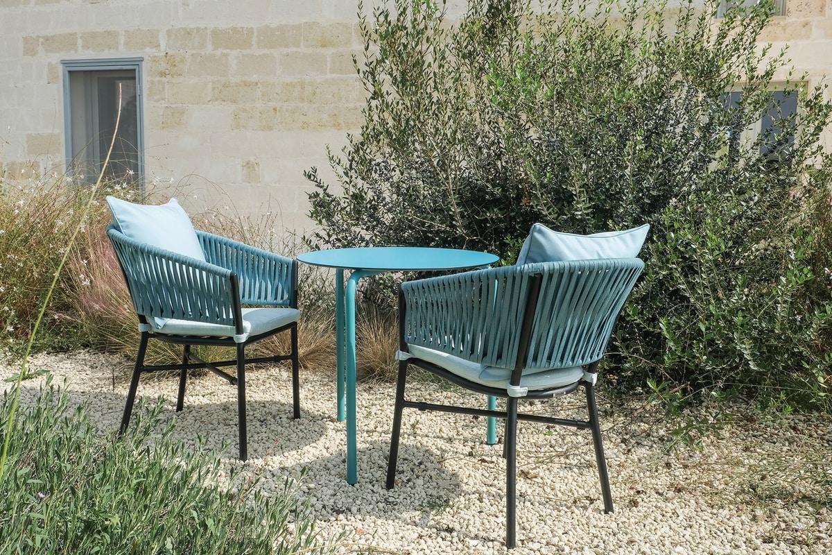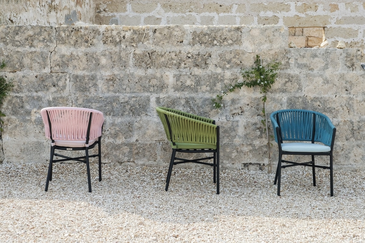 Die zarte Textur der Rückenlehne ist das Hauptmerkmal dieser Kollektion. Es ist die Geschmeidigkeit des Kabels im Dialog mit den Linien des Rahmens, die der gesamten Einrichtung Leichtigkeit und Eleganz verleiht.