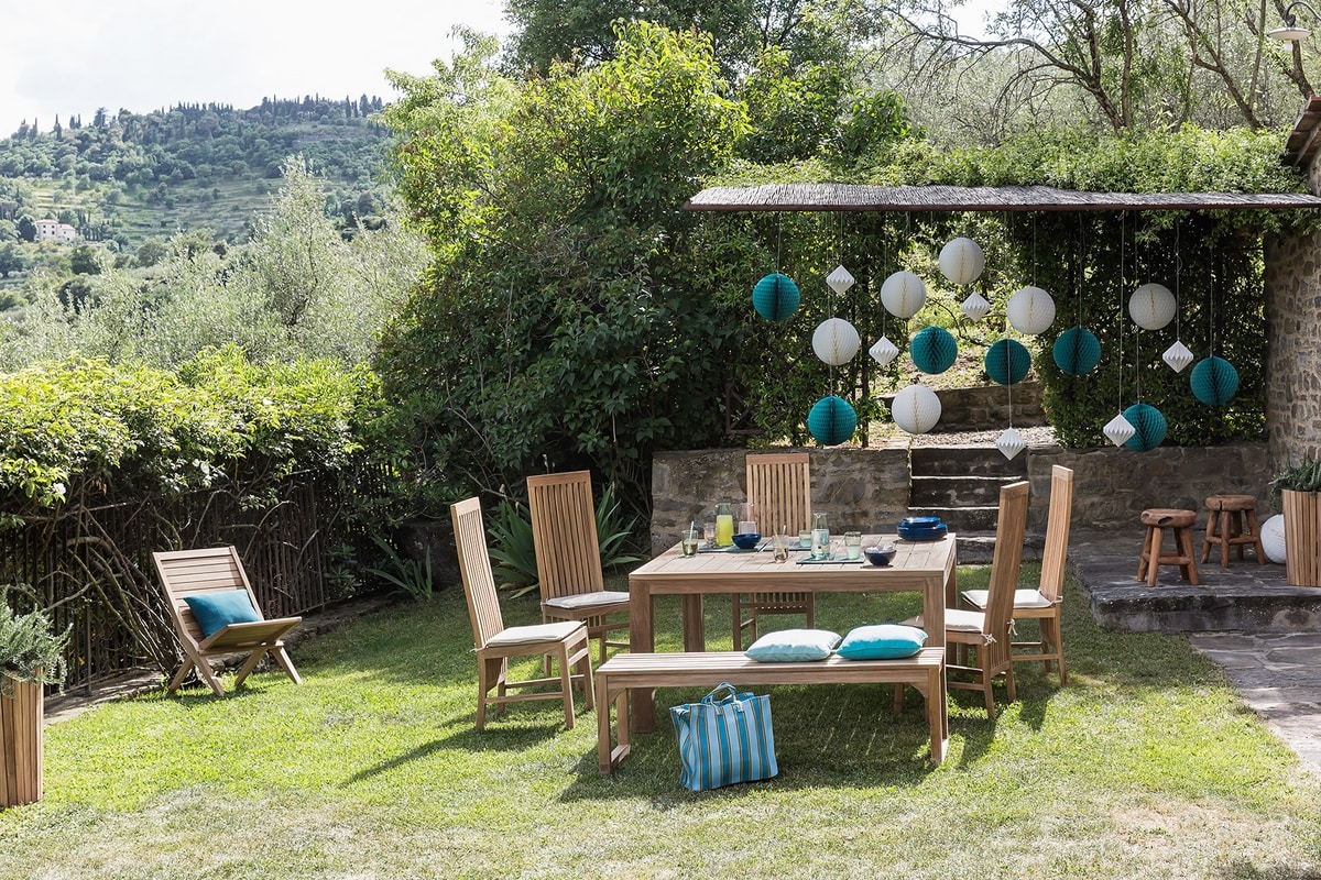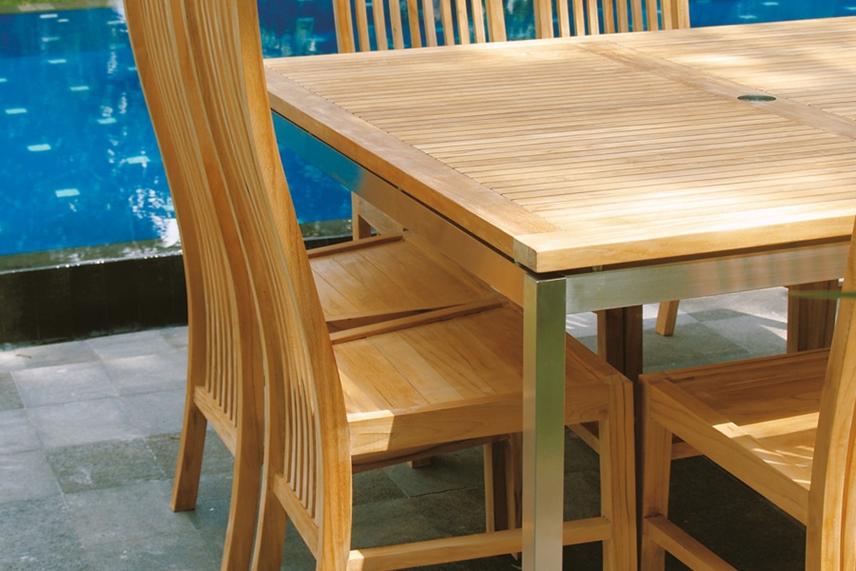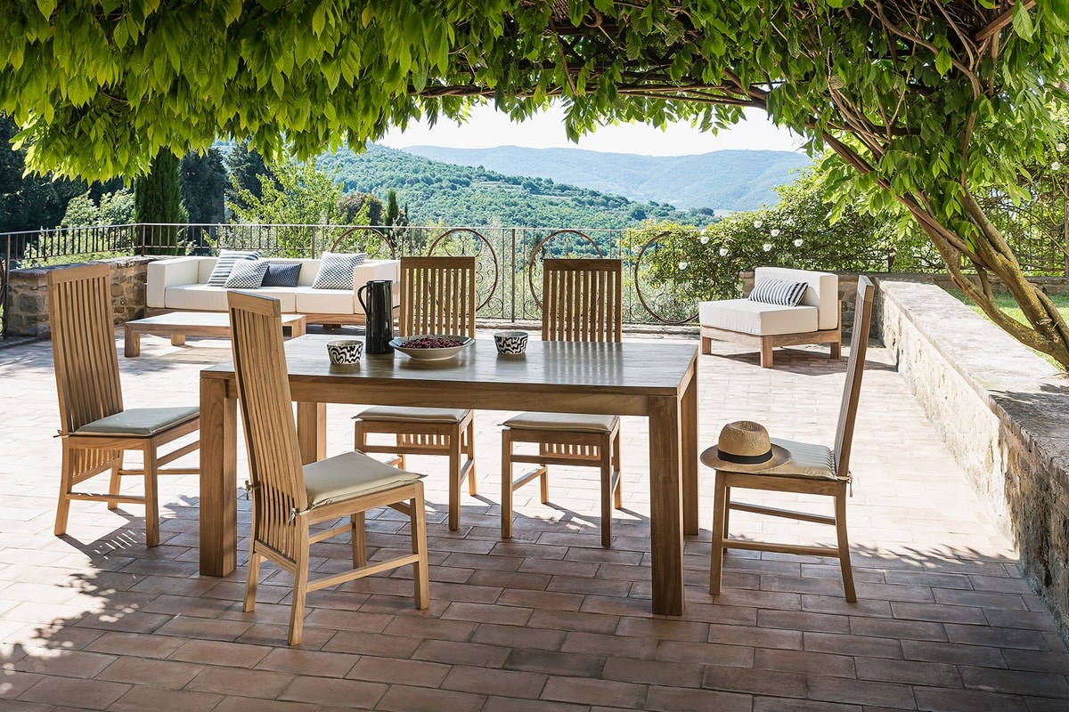 Esszimmerstuhl definiert von seiner hohen und bequemen Rückenlehne. Ein Teakholzstuhl, der eine harmonische Mischung aus Sinnlichkeit und Eleganz ist. Aus wetterbeständigem, unbehandeltem Teakholz mit Feinschliff. Auf Anfrage in den Ausführungen Protective, Oil and Wax oder Java Brown erhältlich.