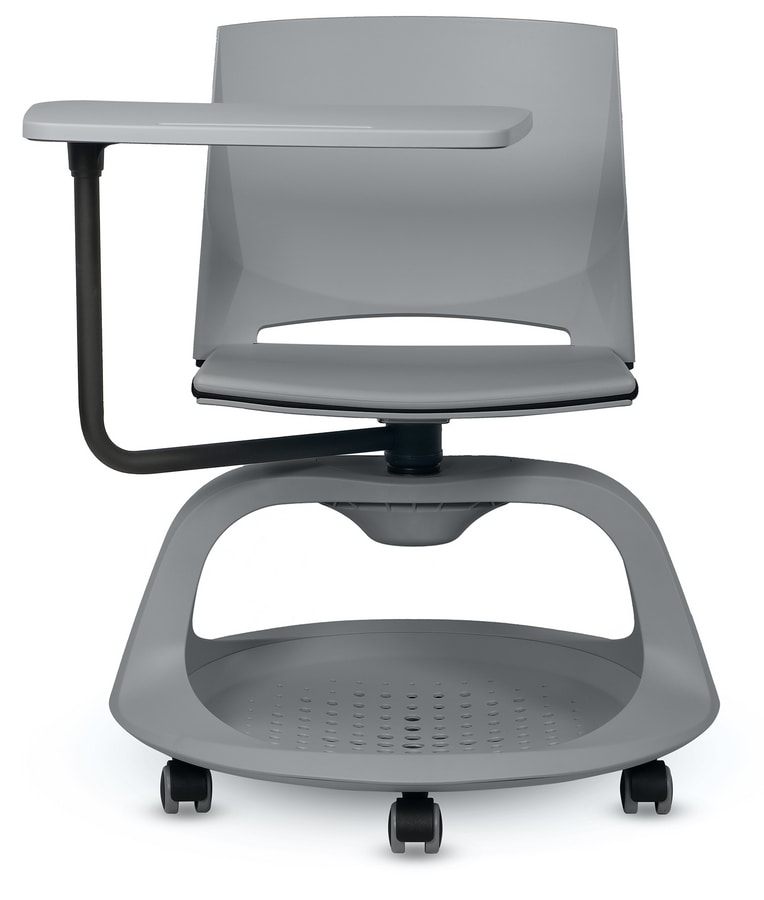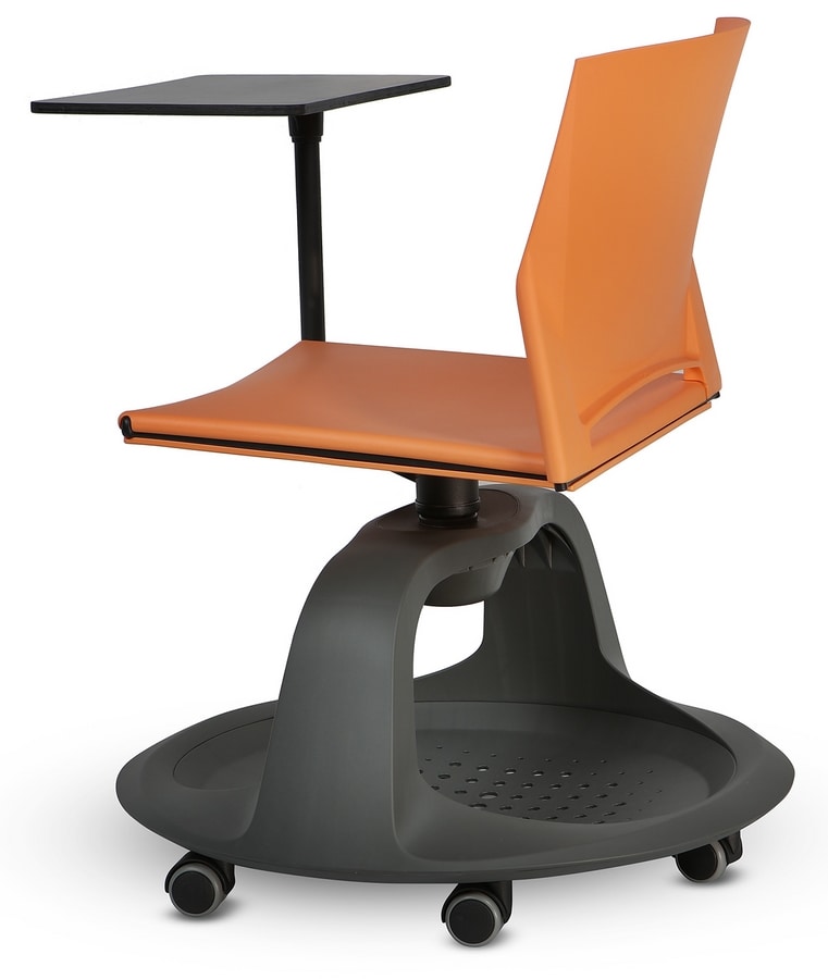 Drehsitze mit Nylonsockel mit Behälter mit 6 Rädern, erhältlich in Anthrazit oder Grau, oder Drehsitz auf 5-Sterne-Nylonsockel mit Rädern oder Füßen und mit hydropneumatischer Höhenverstellung, beidhändige Orbital-Tablette aus schwarzem HPL, eingesetzt auf einem rotierenden Arm aus Metall. Metallstruktur für Trek-Stühle aus Copolymer.