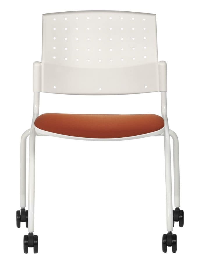 Stuhl mit Metallrahmen, gepolsterter Sitz und Rücken in perforierten Polymer, Beine mit Rädern.