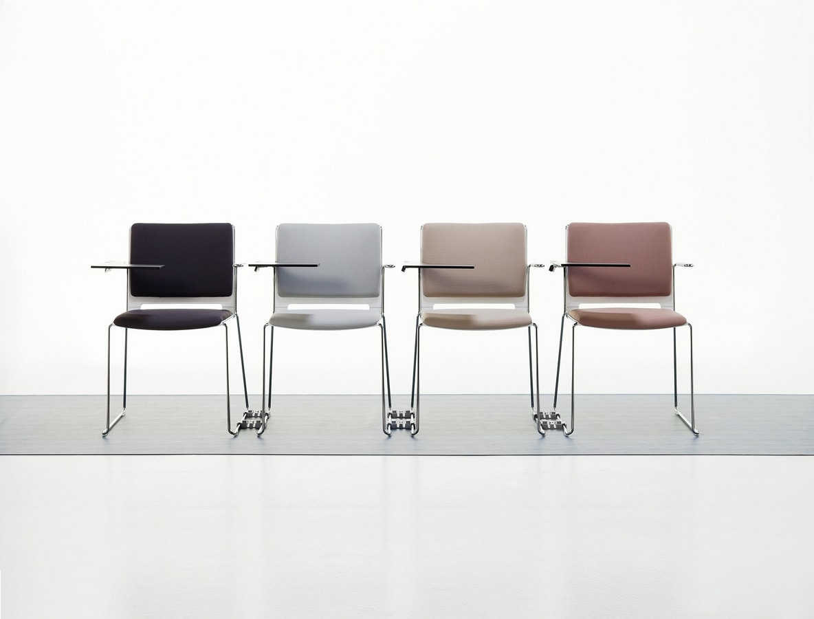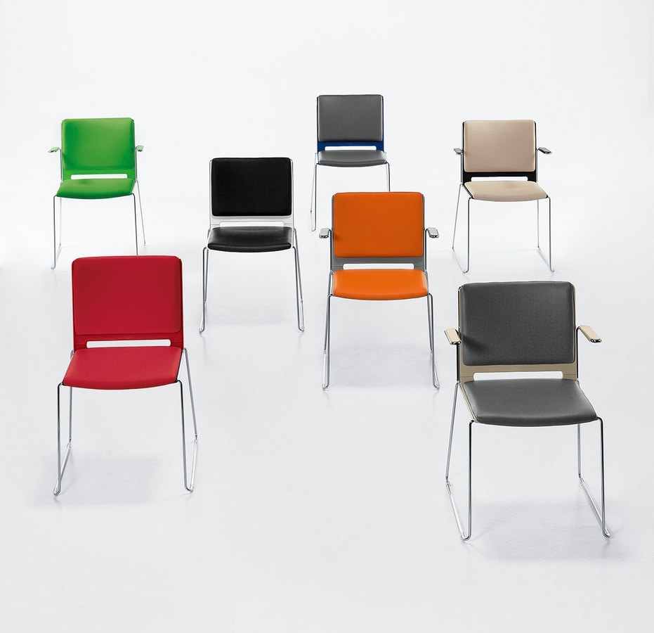 Gepolsterte stapelbarer Stuhl mit Armlehnen, Stahlbasis