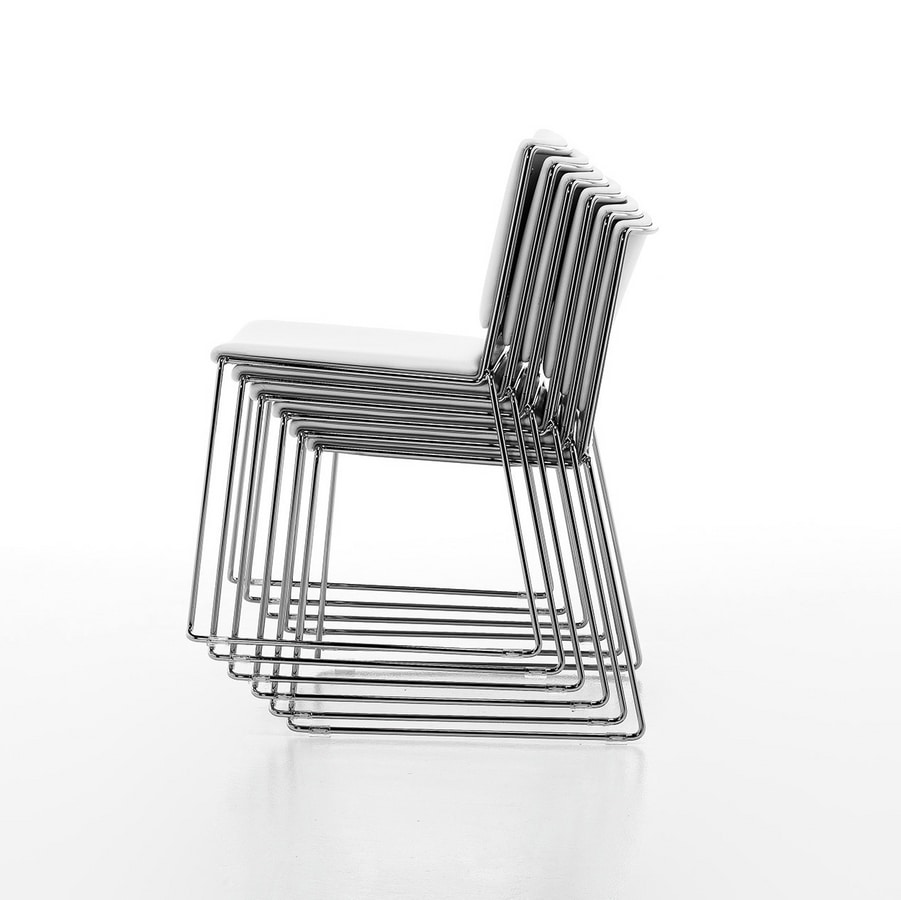 Minimalistischer Stuhl mit Sitz und Rückenlehne aus Polypropylen, gepolsterten Kissen und integriertem Gestell aus Chromstahl. Geeignet für Innen- und Außenbereiche, erhältlich in zwei Versionen, Stuhl und Sessel und in sieben Farben.