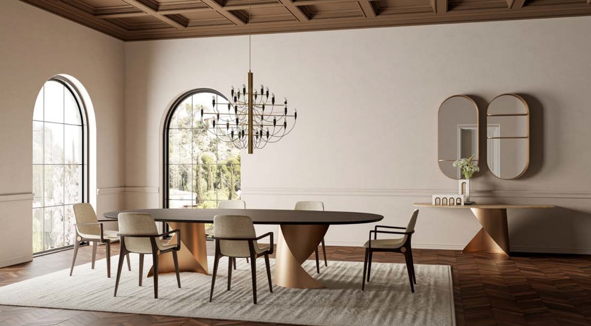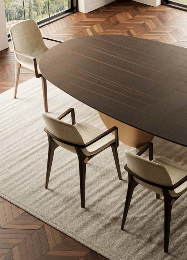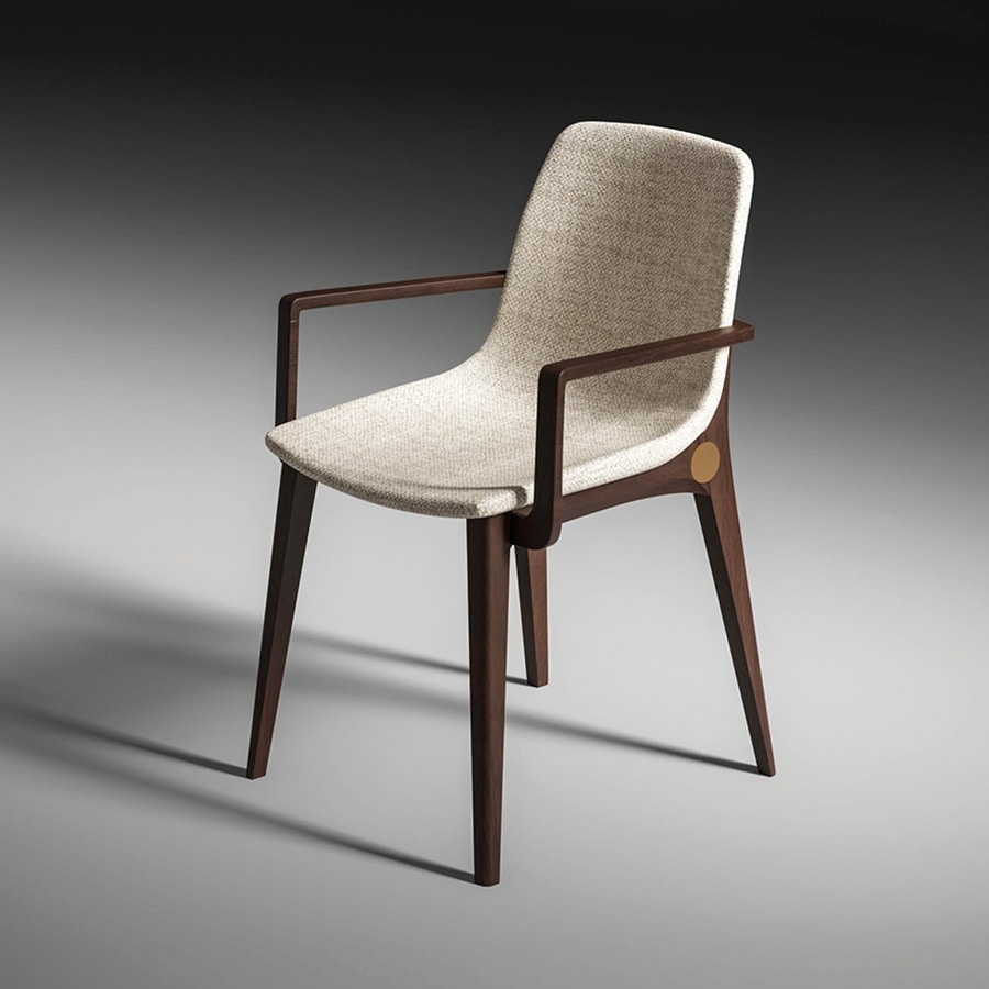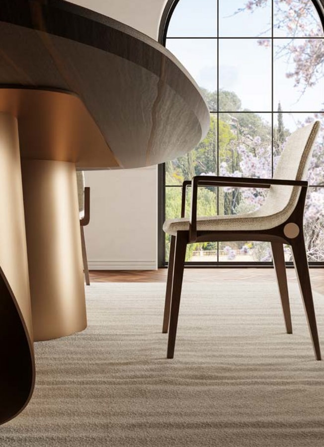 Die Armlehnen folgen einem geometrischen und schlanken Profil und gehen nahtlos in die Hinterbeine über. Der Sitz und die Rückenlehne bestehen aus einem gepolsterten Monocoque mit weichen Linien, das so gestaltet ist, dass es sich ergonomisch an den Körper anpasst.