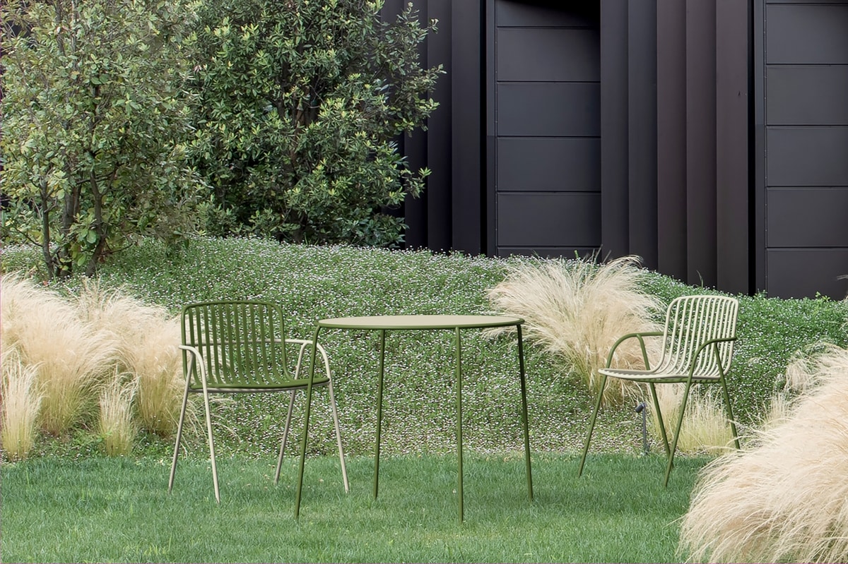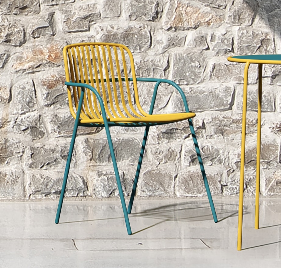 Stapelbarer Stuhl mit Armlehnen, in Stahl für den Außengebrauch, in verschiedenen Farben und auch in Bi-Farben-Version erhältlich.