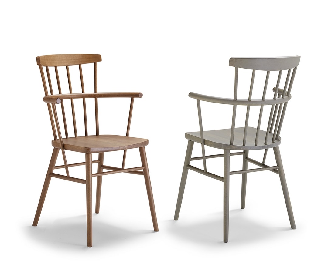 Stuhl mit Armlehnen, aus Buche, in verschiedenen Farben gebeizt oder lackiert, mit Holzsitz oder mit gepolstertem Sitz, erhältlich in Stoff, Kunstleder oder Echtleder. Möglichkeit, das Produkt individuell anzupassen.