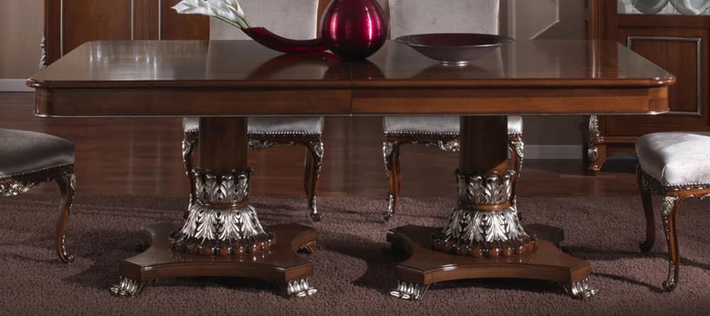 Ausziehbarer Tisch im klassischen Stil mit eingelegter Holzplatte und 2 Sockeln.
