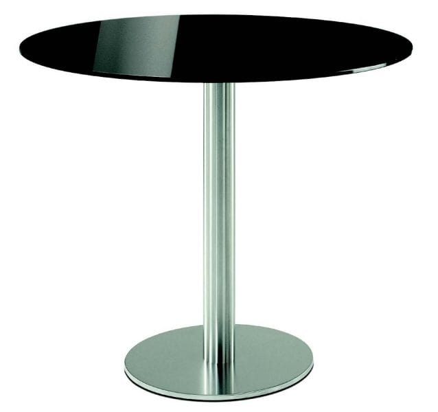 Basis aus rundem Edelstahl (Durchmesser 45 cm). Maximale Abmessungen der Oberseite: 65 × 65 cm oder 90 cm. Zylindrische Säule. Gewicht 17kg. In verschiedenen Ausführungen erhältlich.