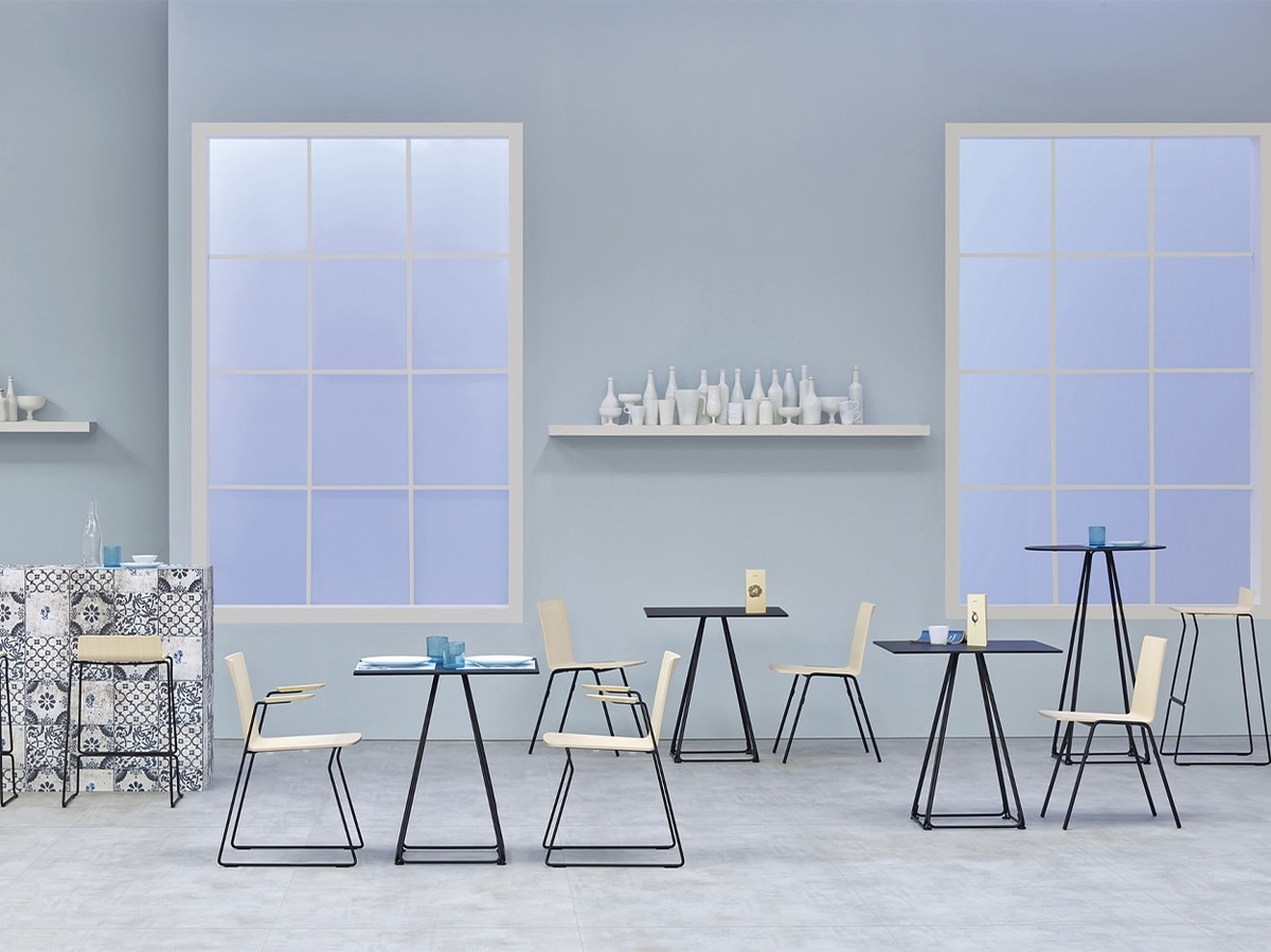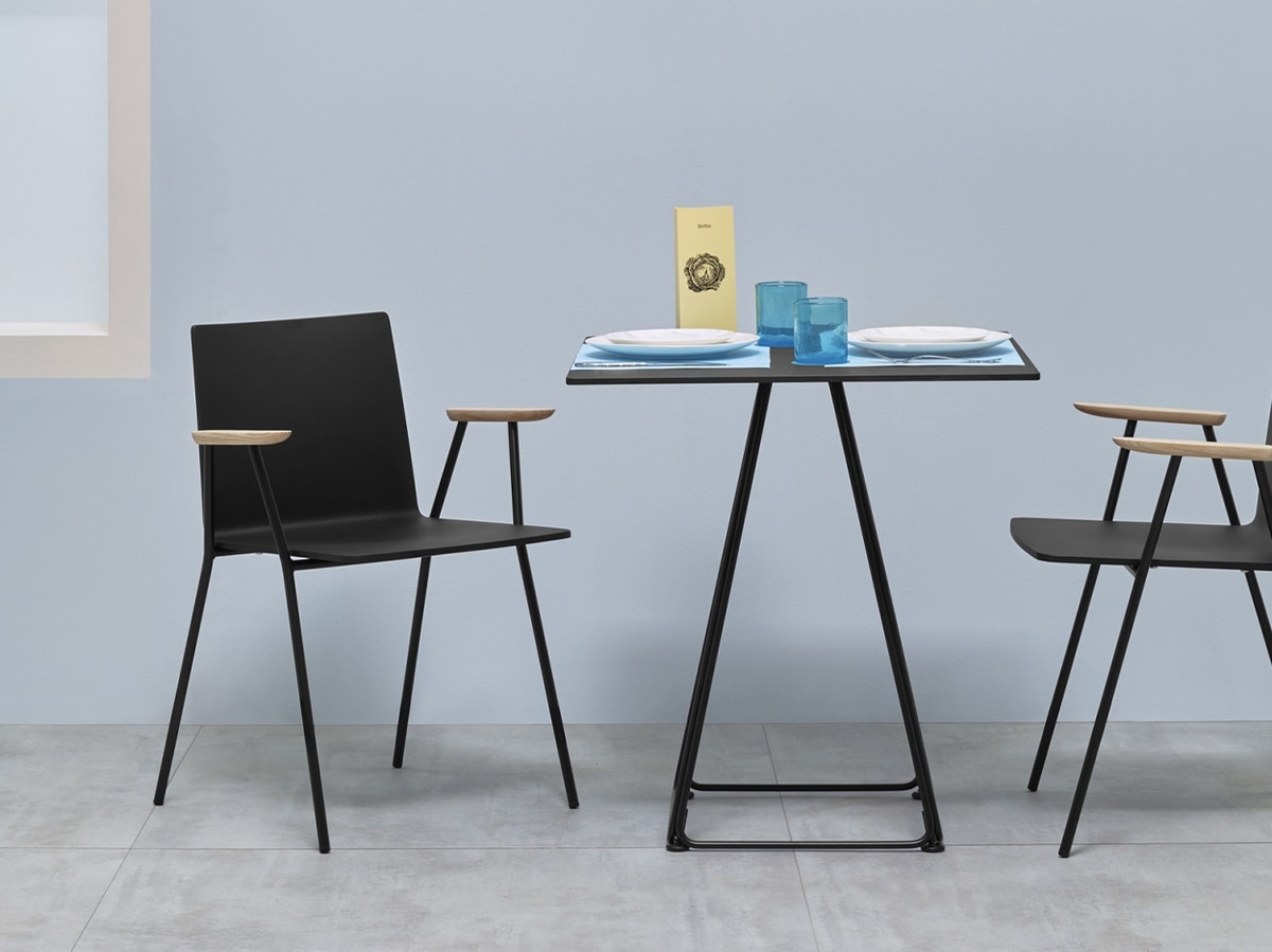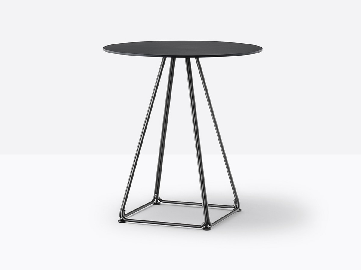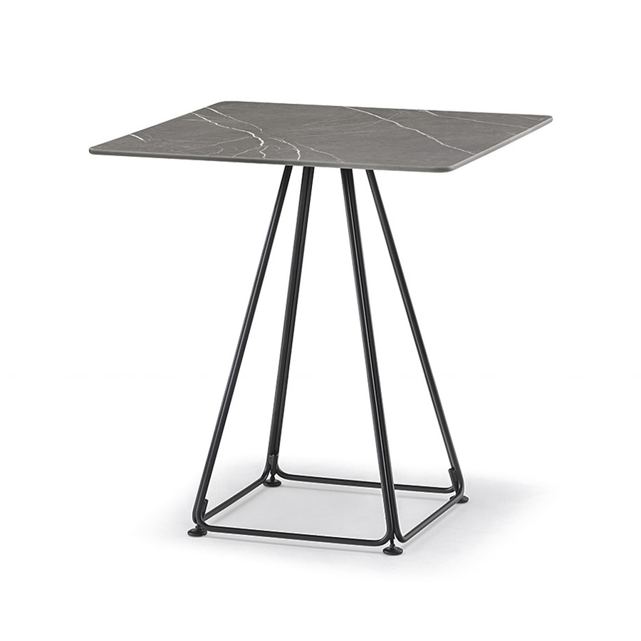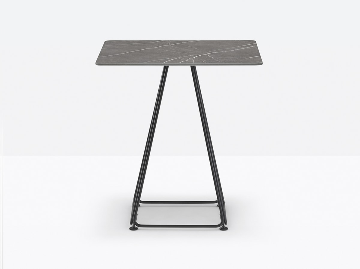 Stellen Sie sich einen Tisch vor, der die Sprache des Minimalismus und der Eleganz spricht, Raum für Hohlräume lässt und sich nahtlos in die umgebende Architektur und Umgebung einfügt. Seine einzigartige Struktur, bestehend aus vier Trapezen aus Stahlstangen, verleiht dem Tisch einen unverwechselbaren und modernen Charakter.