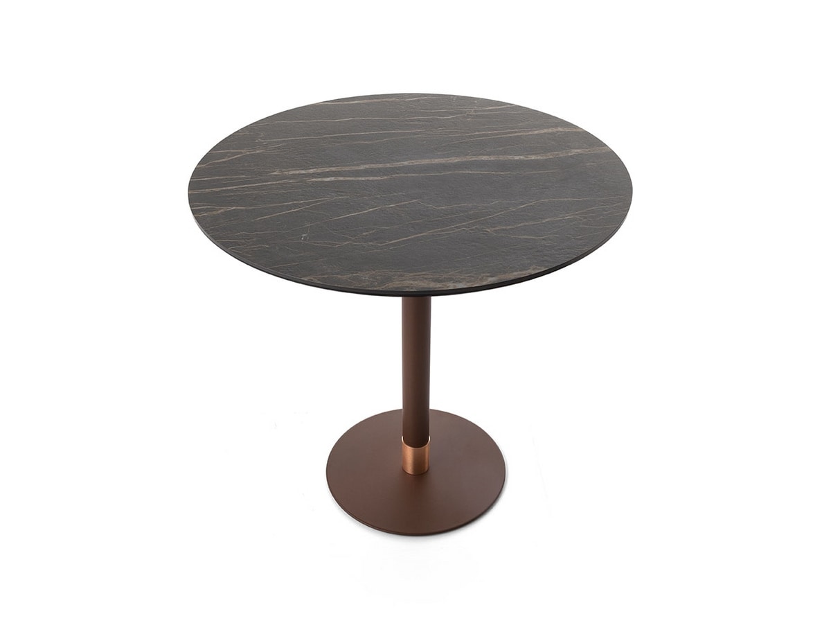 Dieser Tisch verfügt über ein Gestell mit einfachen und eleganten Linien und eignet sich perfekt für Umgebungen wie Kaffeebars, Bistros und Hotels. Der Ring-Rundsockel besteht aus einer Säule mit einem Durchmesser von Ø 60 mm und einem Sockel mit einem Durchmesser von 420 mm, komplett mit einem dekorativen galvanischen Gold- oder Messingkragen und verstellbaren Füßen.