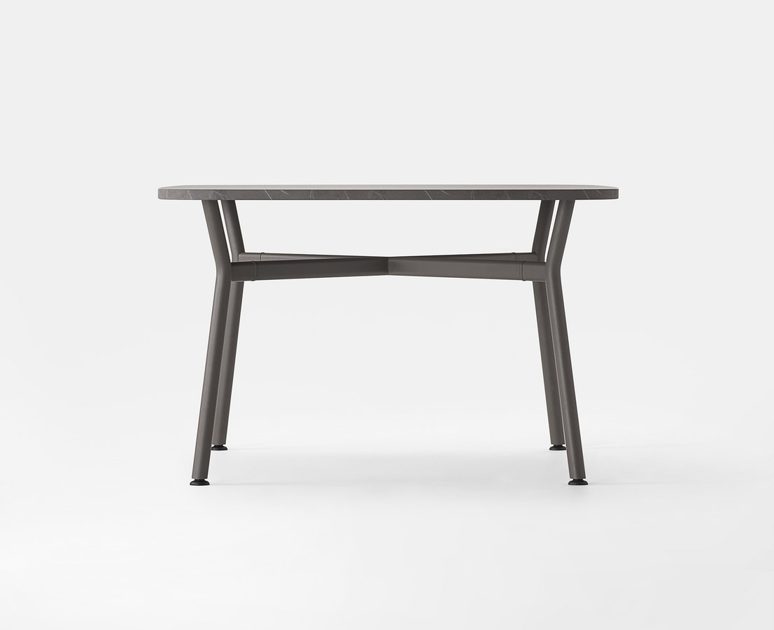 Die Kreuzstruktur zeichnet eine klare, skulpturale Architektur. Die runden, großzügig dimensionierten Beine treffen auf ovale Querstreben und formen gemeinsam ein starkes, dabei nahezu unsichtbares Tragegerüst – perfekt ausbalanciert zwischen industrieller Strenge und formaler Leichtigkeit.