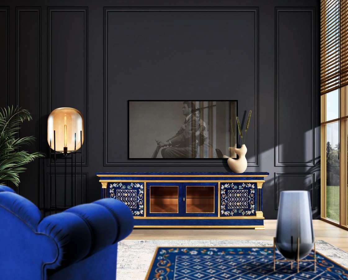Erable Blue TV-Möbel mit farbigen Perlmuttdetails, zentraler Glastür und seitlichen Schubladen, heller, natürlicher Innenraum, eingelegte Oberseite, natürliches Finish.