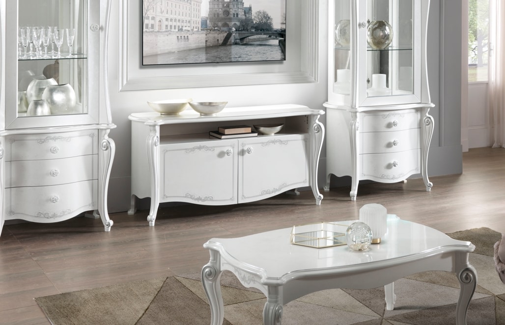 Kleines klassisches TV-Möbel mit zwei Türen und Tagesfach. Weißes Perlmutt, von Hand bemalt und verziert.