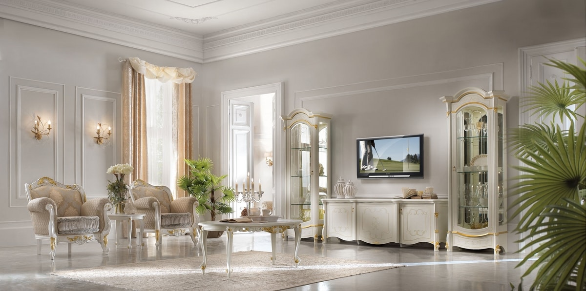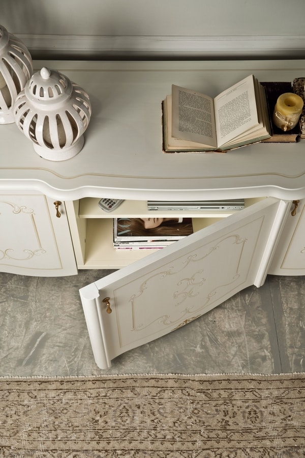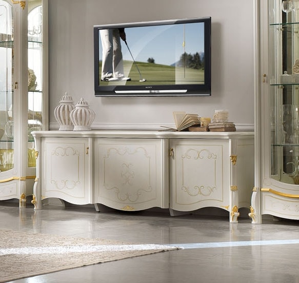 Niedriger TV-Schrank / niedriges 3-A-Sideboard. Lackierte Holzstruktur mit goldenen Details.