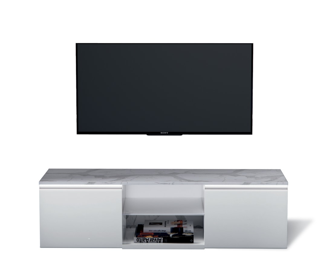 TV-Ständer mit weißer lackierter Struktur und Türen mit Innenausstattung von Carrara Marmoreffekt.