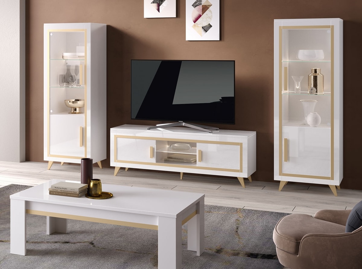 Niedriger TV-Ständer aus weiß glänzend lackiertem Holz mit goldenem Siebdruck. Ausgestattet mit einem offenen Fach mit LED-Beleuchtung.