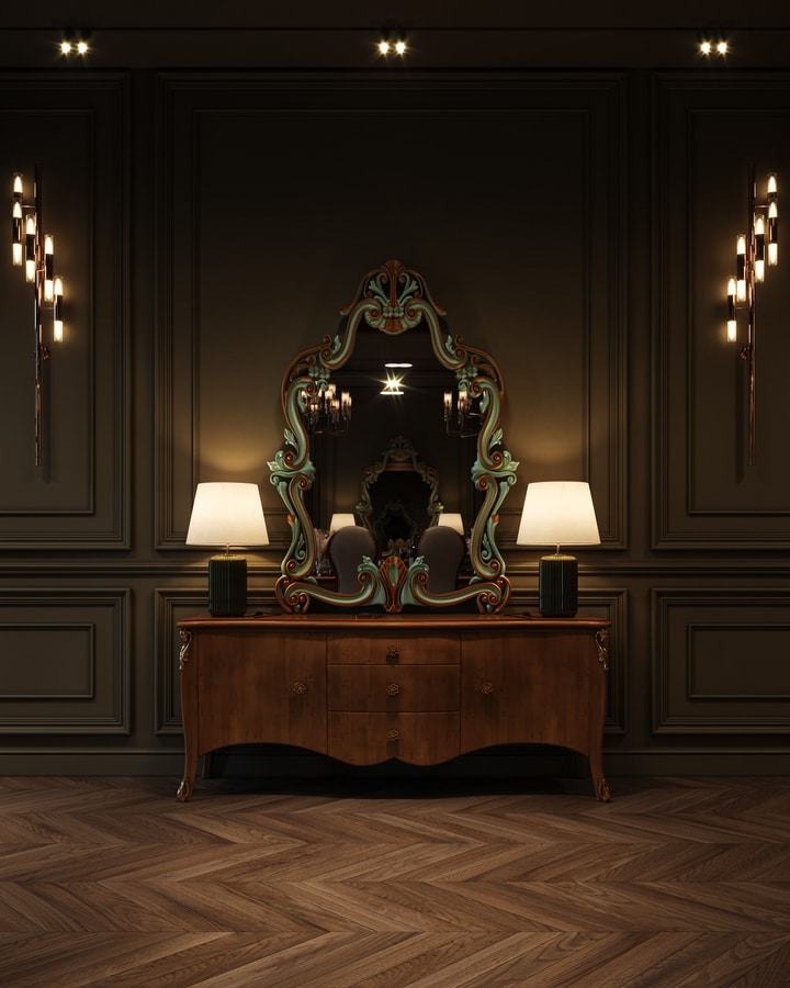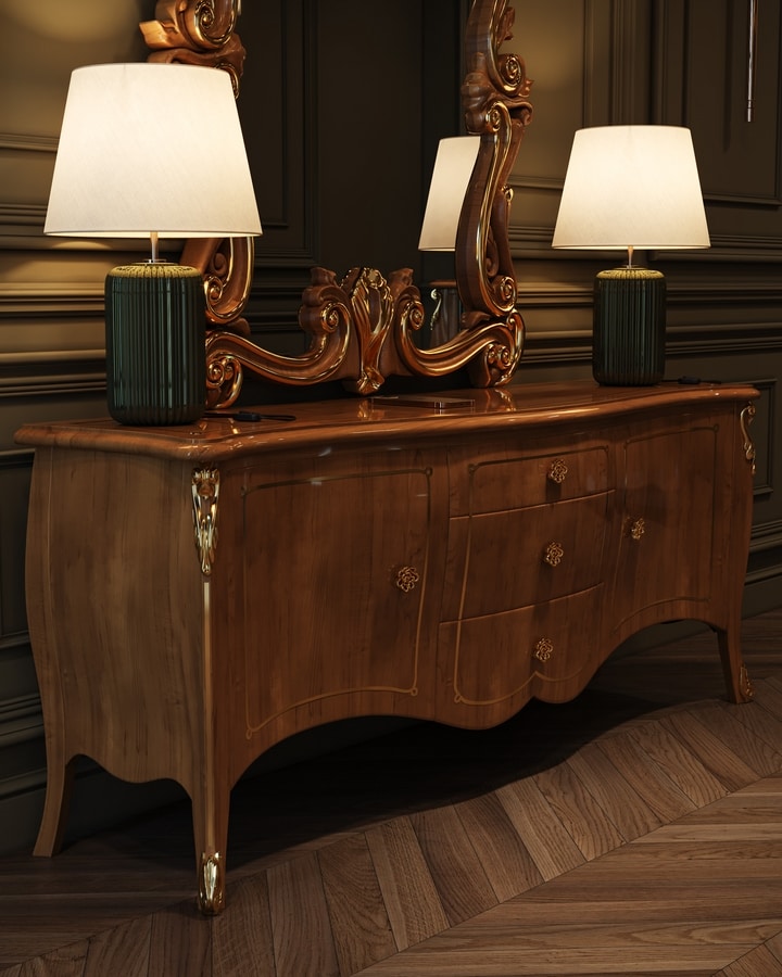 Niedriger TV-Schrank im klassischen Stil aus Holz.