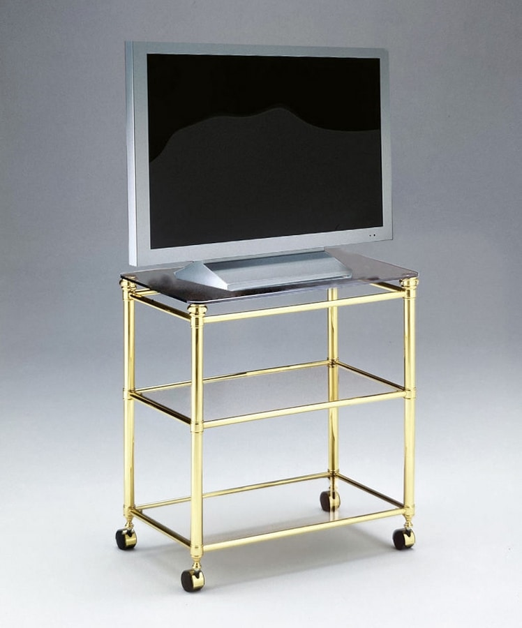 TV Wagen mit polierten Messingstruktur und transparente Glasplatte.