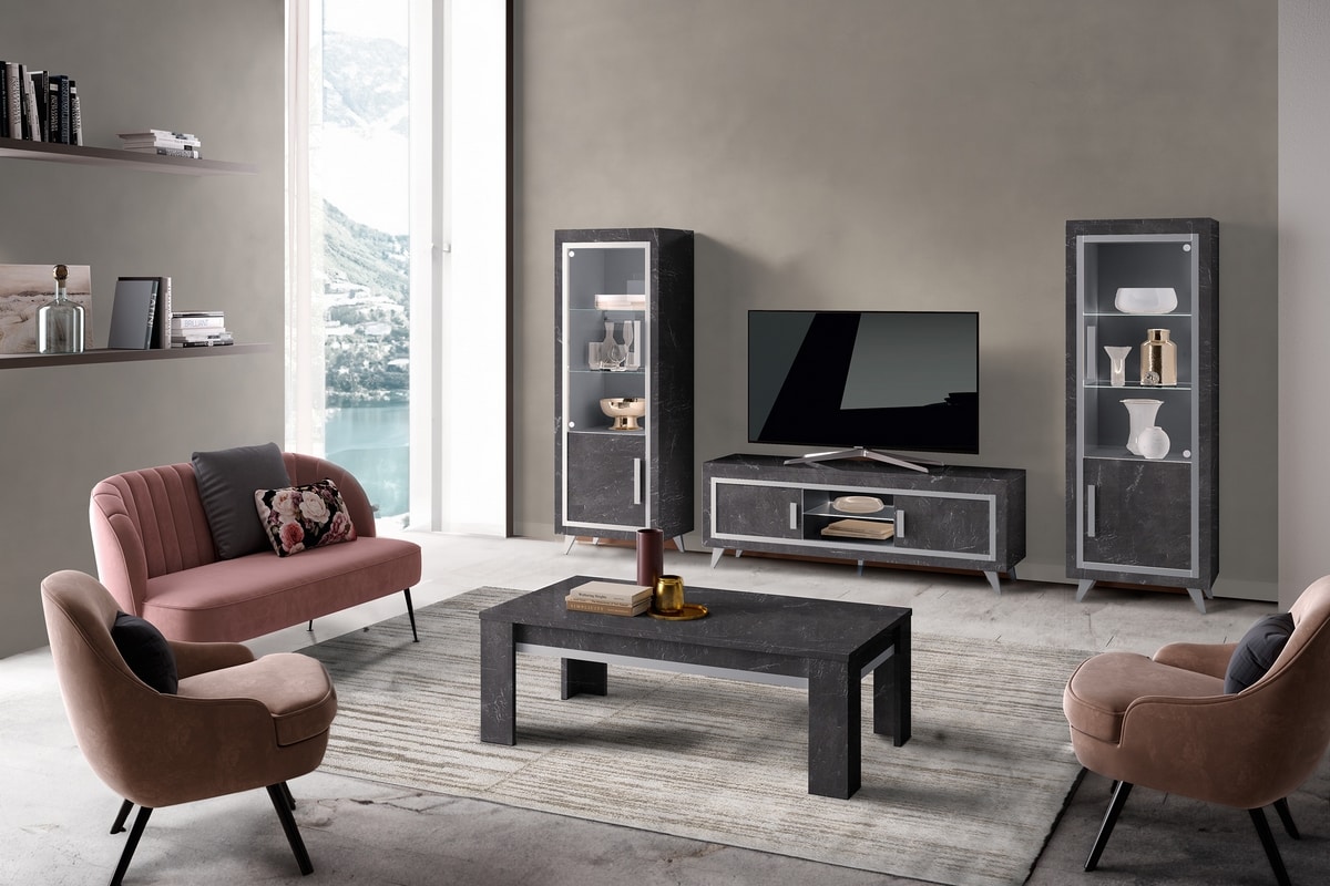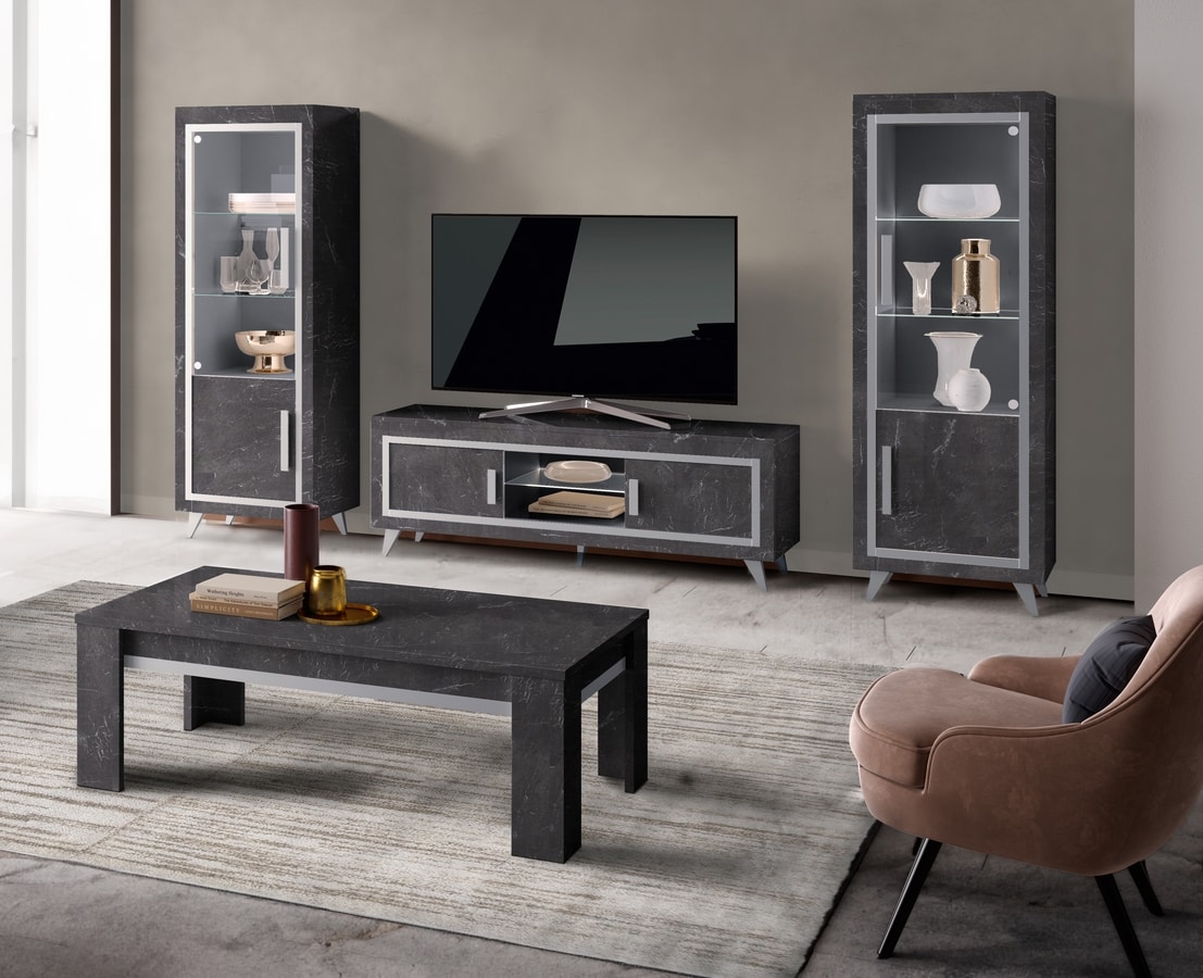 Niedriger TV-Schrank. Aus Holz mit glänzender Marmoroptik und silbernem Siebdruck. Mit offenem Fach. Glas Regal. Ausgestattet mit LED-Beleuchtung.