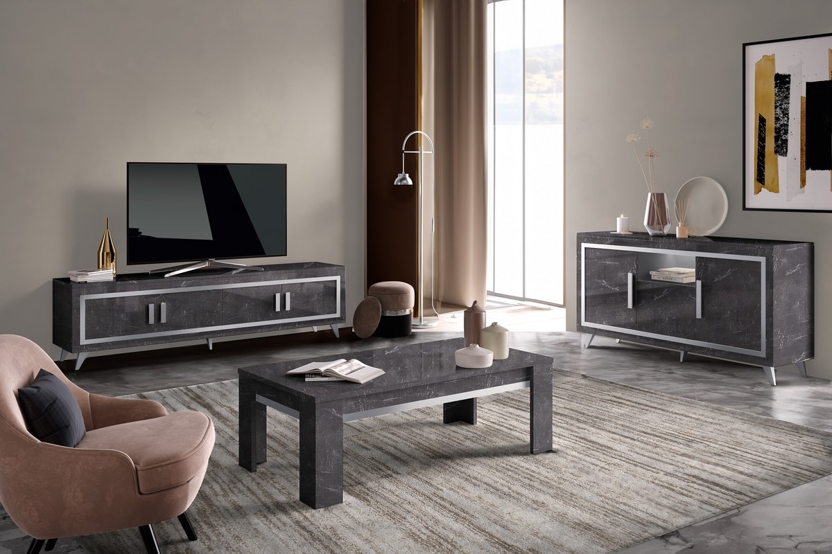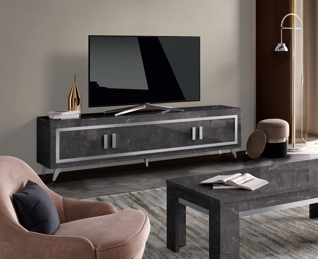 Niedriger TV-Schrank. Aus Holz mit glänzender Marmoroptik und silbernem Siebdruck. Ausgestattet mit vier Türen. Mit offenem Fach. Glas Regal. Ausgestattet mit LED-Beleuchtung.