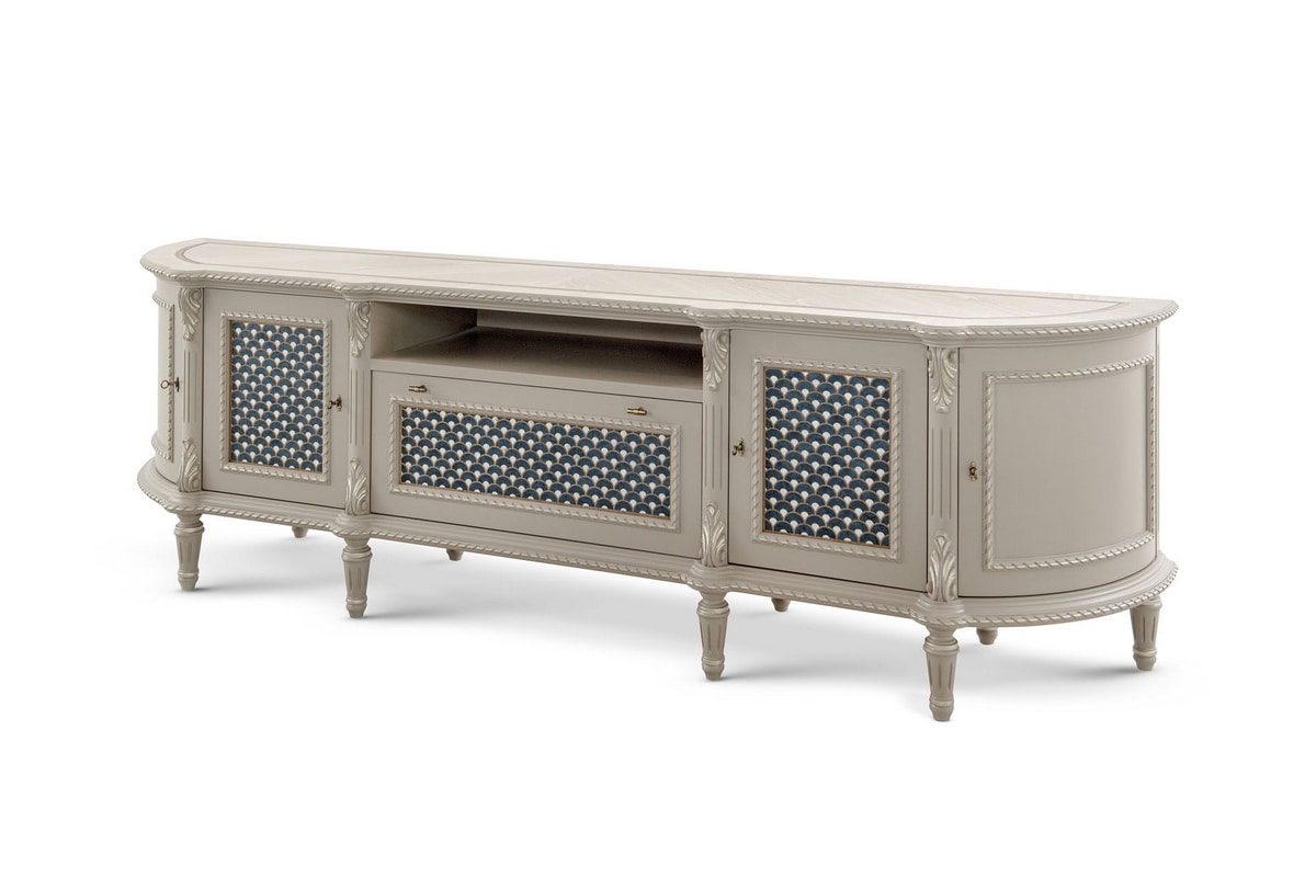 Niedriger TV-Schrank, Struktur und Teile aus Massivholz mit 2 seitlichen Türen mit mattgrauer Lackierung, 3 zentrale Türen mit feiner Perlmutt-Intarsien, blau getönt, mit Profil aus Canaletto-Nussbaum, mit offenem Fach, Platte aus furniertem Holz Grau getöntes Canaletto-Walnussholz und dekorative Profile in Blau- und Nussbaumtönen, mit verzierten Schnitzereien.