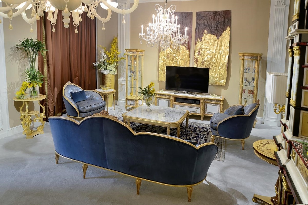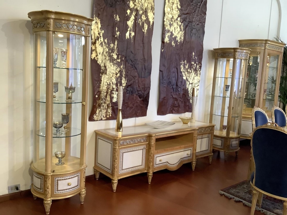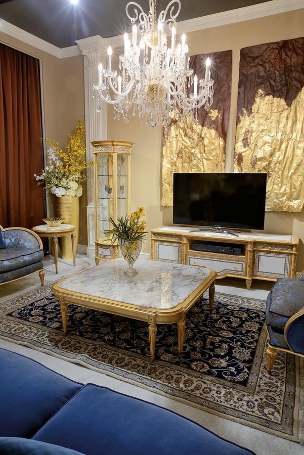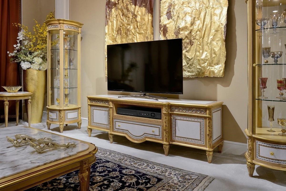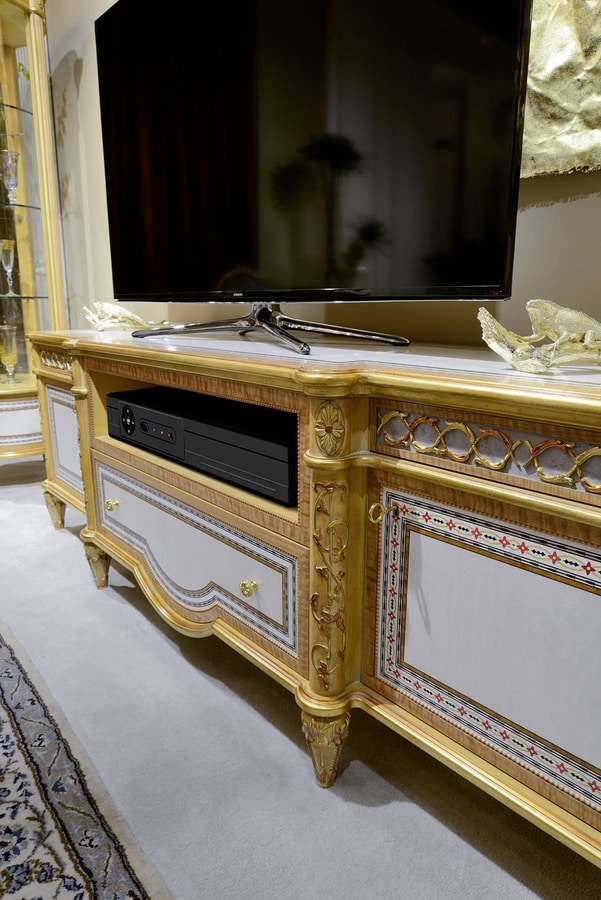 Preise anfordern Ähnliche ProdukteKlassische TV-Schrank-Reproduktion im Louis XVI-Stil. Es ist reich an geschnitzten Details in Decapè-Finish mit Gold- und Bronzetönen. Die lichtechten Platten erhellen das Möbelstück und akzentuieren die blauen geometrischen Einlagen, die zur Wohnzimmerpolsterung passen. Die gleichen Details wiederholen sich sowohl an den Türen als auch an der Holzplatte. Diese Kollektion wurde entworfen, um das Haus bei 360 Grad einzurichten. Wir finden den gleichen Stil für das Schlafzimmer, für diejenigen, die einen TV-Raum haben, im Esszimmer und für das Wohnzimmer. Auf Wunsch auch für die Küche!