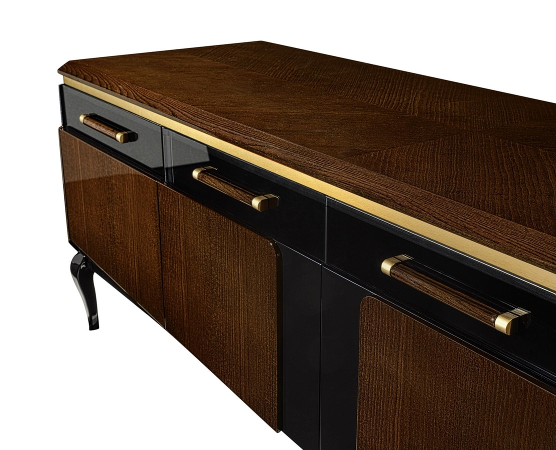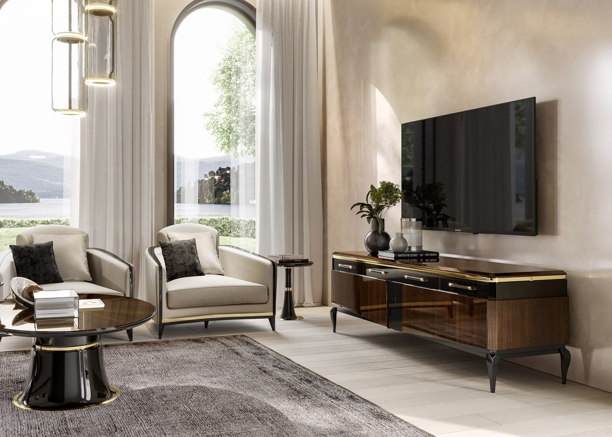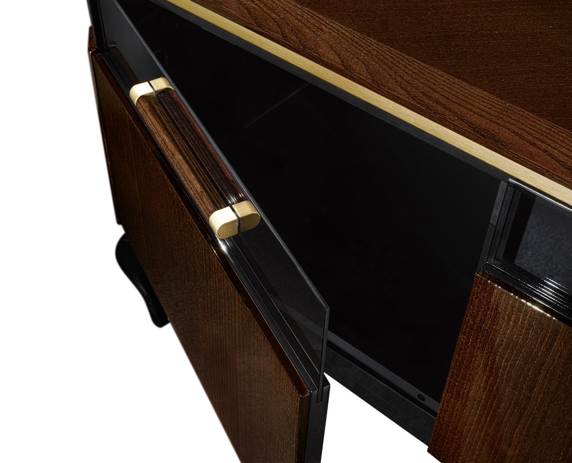 Fernsehschrank mit 4 Türen. In Esche furniert. Metallprofile. Erhältlich in den glänzenden Oberflächen Imperador Mokka und Elfenbeinsand. Lackierter Innenraum mit Glasregalen.