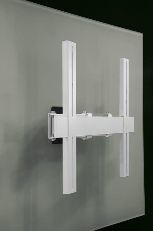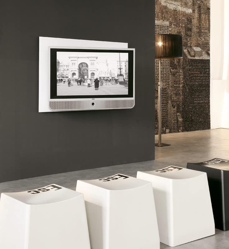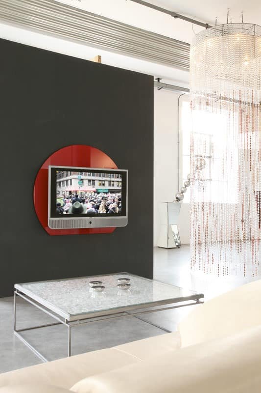 Rechteckige oder geformten farbigen gehärtetem Kat. D / E 8 mm dickem Glas zurück-TV. Melamin 20 mm dicke Rückwand mit verstellbaren Halterungen für die Wandbefestigung und mit zentralen Oberfläche für Kabel Passage. Zentralen TV-Halterung mit direkten Wandbefestigung, ausziehbar und schwenkbar bis 40 ° pro Seite. Geeignet für maximal 26 kg Gewicht TV.