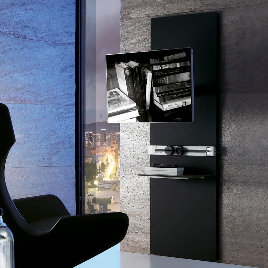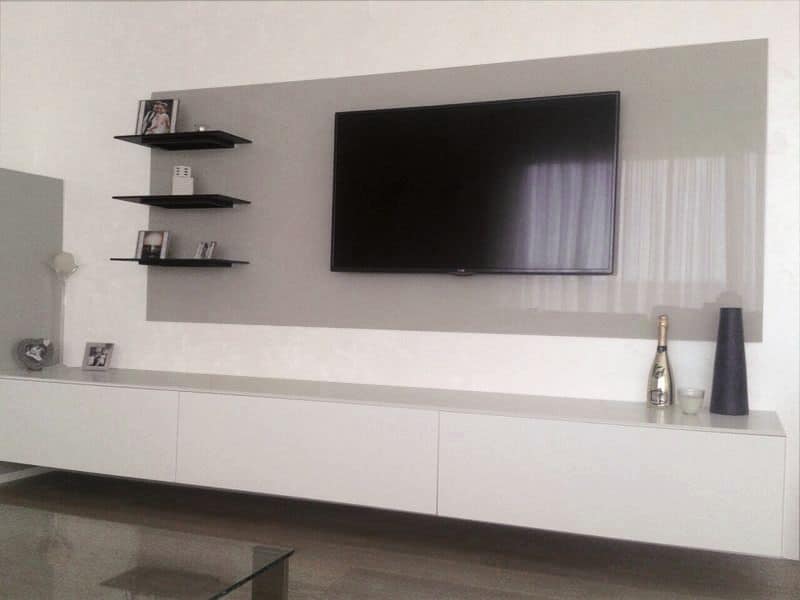 Ausgeglichenes farbigen cat.D / E 8 mm dickem Glas TV-Gerät. Melamin 20 mm dicken Rückwand mit verstellbaren Halterungen für die Wandbefestigung und mit Mittelfläche für Kabel Gang. Zentrale TV-Halterung mit direkter Wandbefestigung, ausziehbar und schwenkbar bis 180 °. Glass farbige Katze. D / E Regalen.