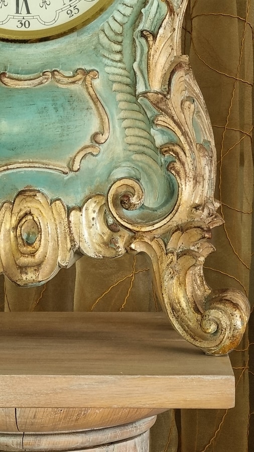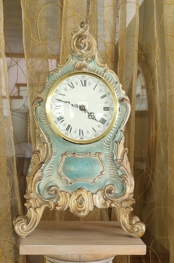 Handgeschnitzte hölzerne Wecker. Batteriemechanismus. Lackiertes Finish mit Details in Blattgold.