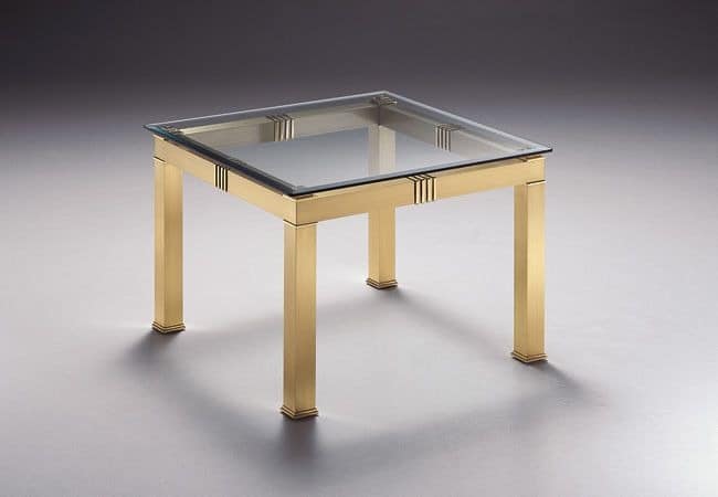 Couchtisch mit satiniertem Messing Struktur und polierten Messingteile , transparentem Glas mit Fase.