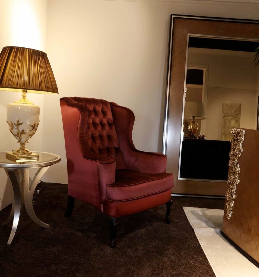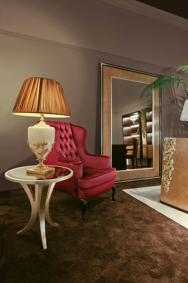 Die Flora-Kollektion ist in den Versionen aus dunkelbrauner Eiche oder aus hell gebeiztem Kotò-Holz und in Aniegré für Wohnzimmer und Büro gefertigt, immer mit Details in Champagner-Blattsilber-Finish.