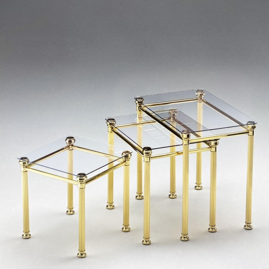 Tische aus poliertem Messing mit transparenten Gläsern.