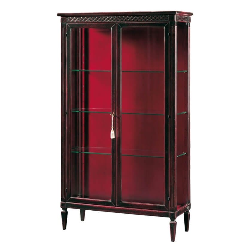 Vitrine aus Lindenholz, mit zwei gerahmten Glastüren mit Schlüssel, Glasböden und Seiten, Holzrücken. Faltbares Oberteil, angereichert mit einem geometrisch geschnitzten Zierband, das sich an den Seiten fortsetzt. Mit vertikalen Fräsern verzierte Säulen enden auf sich verjüngenden Stiftfüßen mit einem einfachen Formteil oben. Auf dem Foto rot gebeiztes ebonisiertes Holz (Code: Nero) und rot lackiertes Interieur (Code: Rosso Faber).